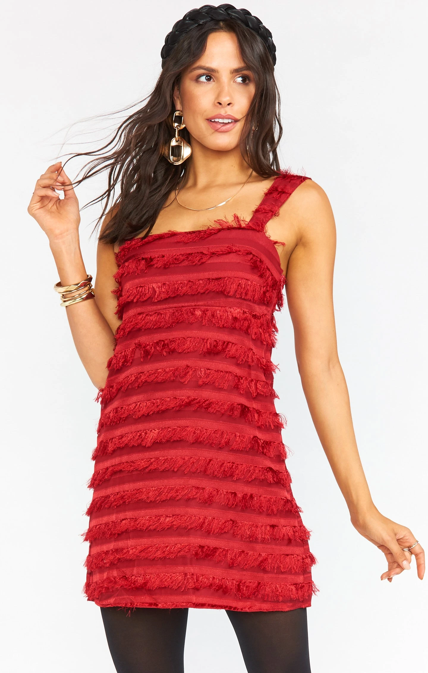 The perfect mini dress for the holidays! This dress features an elastic back panel, side zip closer, square neckline & fringe detailing. Pair this dress with any booties or chunky heel and you’ll be photo ready for your next holiday party!