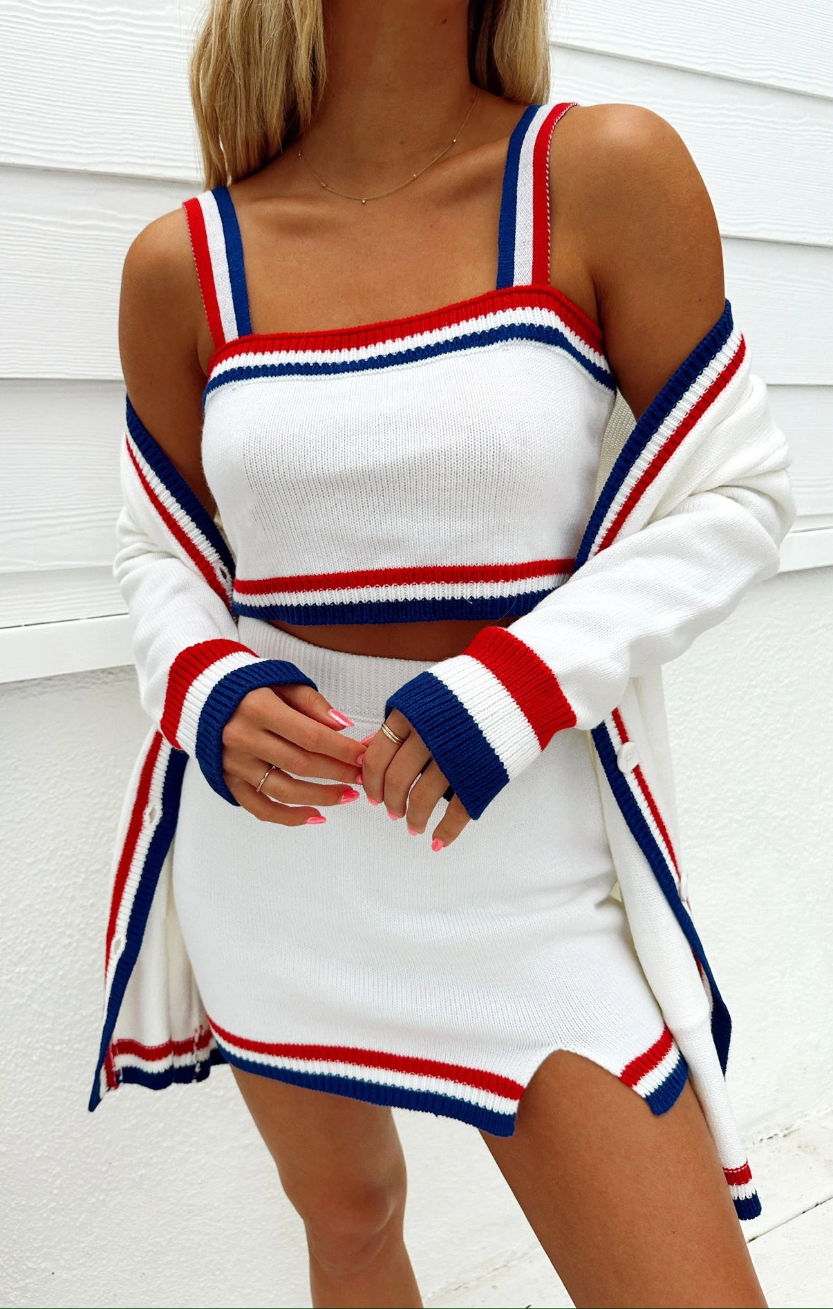 Yacht summer in the Below Deck Mini Skirt. A preppy fitted knit skirt with a side slit and varsity striped hem. Get ready to set sail in the matching Below Deck Tank and Lambert Cardigan paired with canvas sneakers.