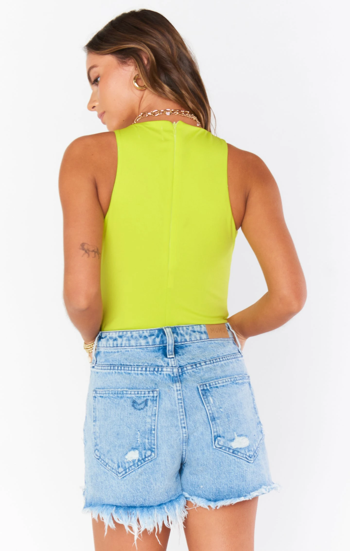 Best of the bodysuits, this is one you need! Complete every look and feel good in this thick neon green bodysuit. A high neck and a zipper up the back create clean and simple lines. Simplify with your fave denim or mix in with more fun patterns.