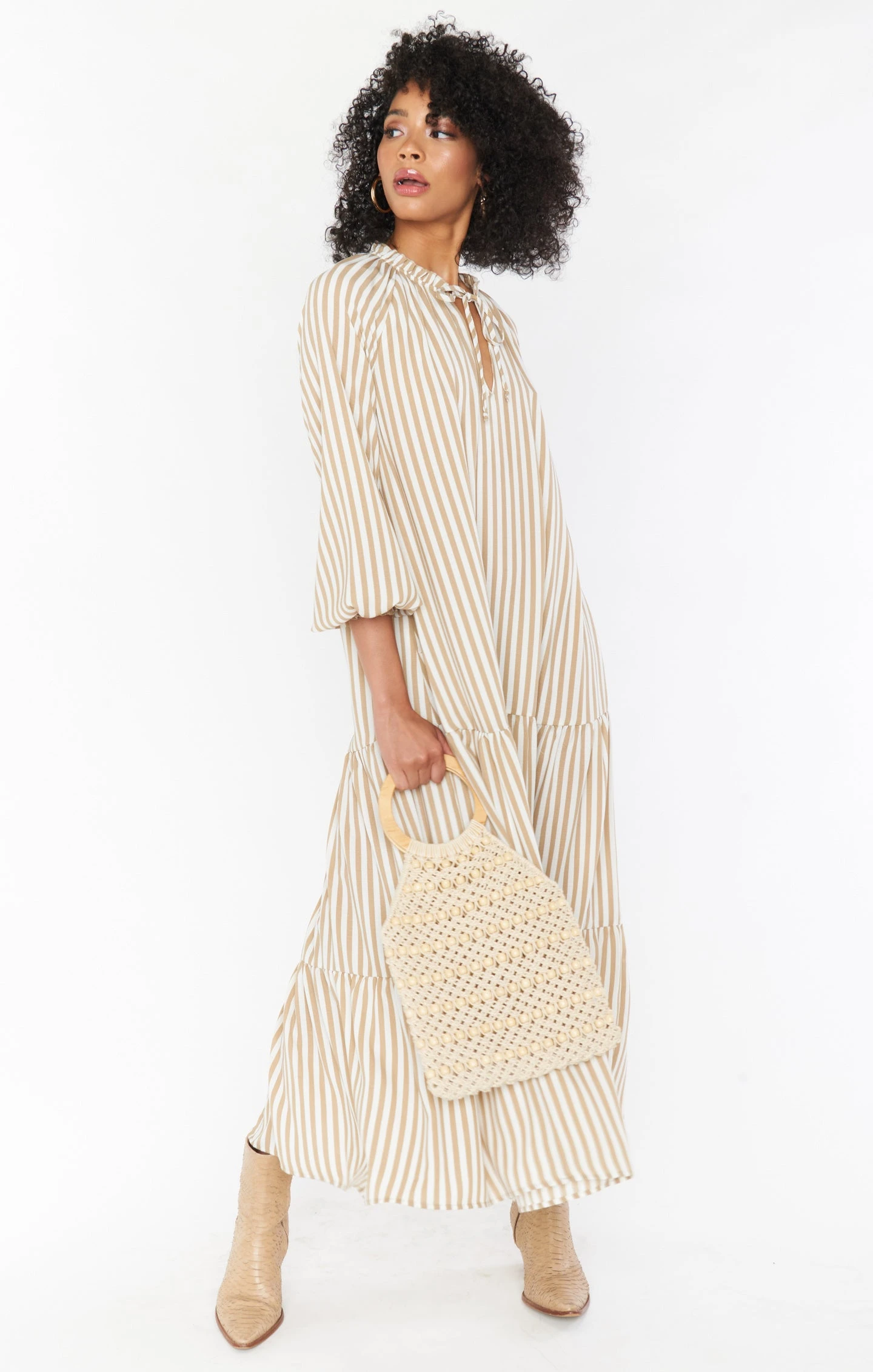 A little Birdie told me that this is the new go-to neutral striped tiered maxi! High on the shoulders with an open v-neck with ties give this a super relaxed vibe while still looking chic. Easily thrown on for a day of errands or can be dressed up for a nice shower or brunch