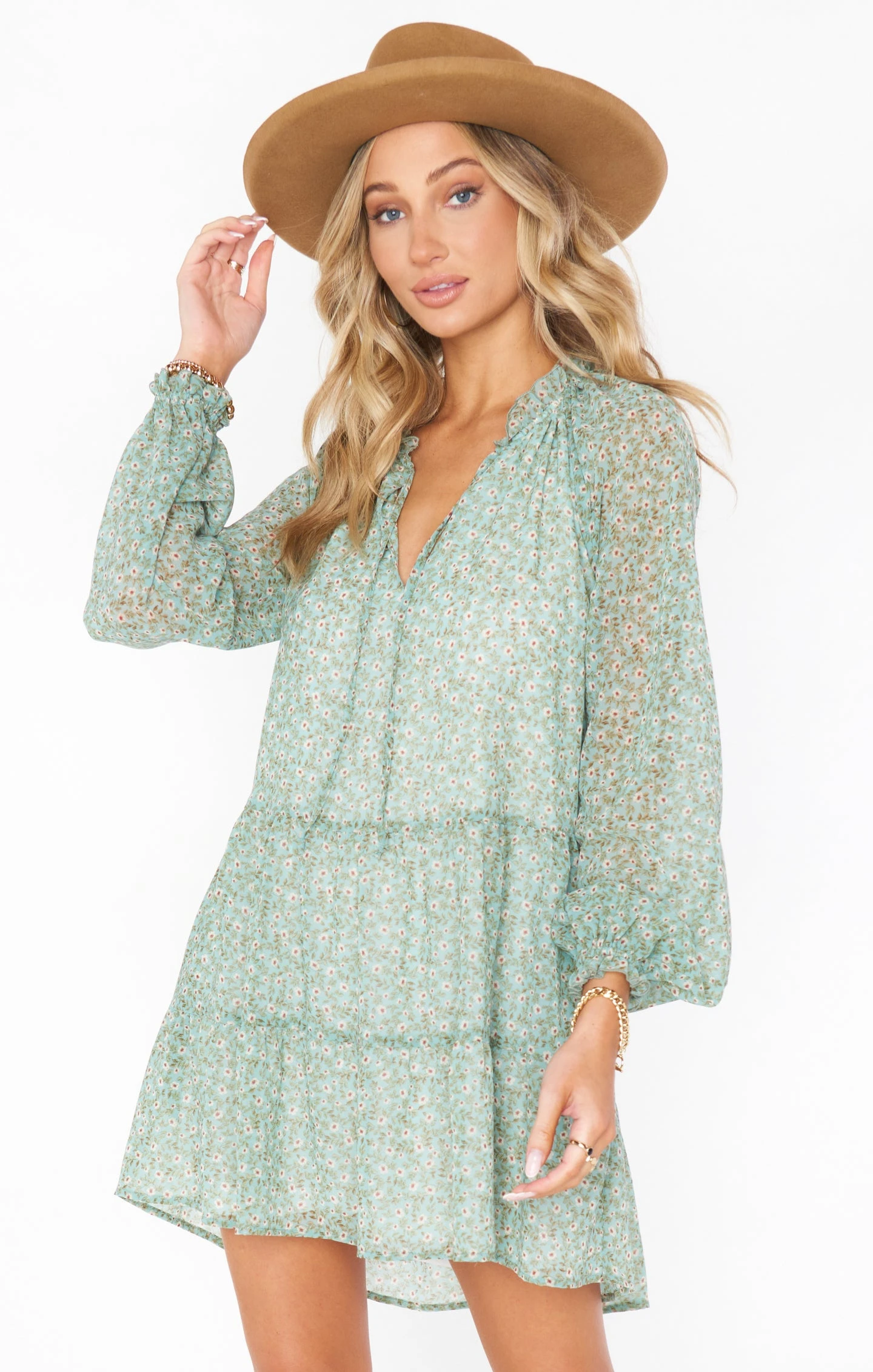 A little Birdie told me that this is the new go-to floral tiered mini! High on the shoulders with an open v-neck with ties give this a super relaxed vibe while still looking chic. Easily thrown on for a day of errands or can be dressed up for a nice shower or brunch!