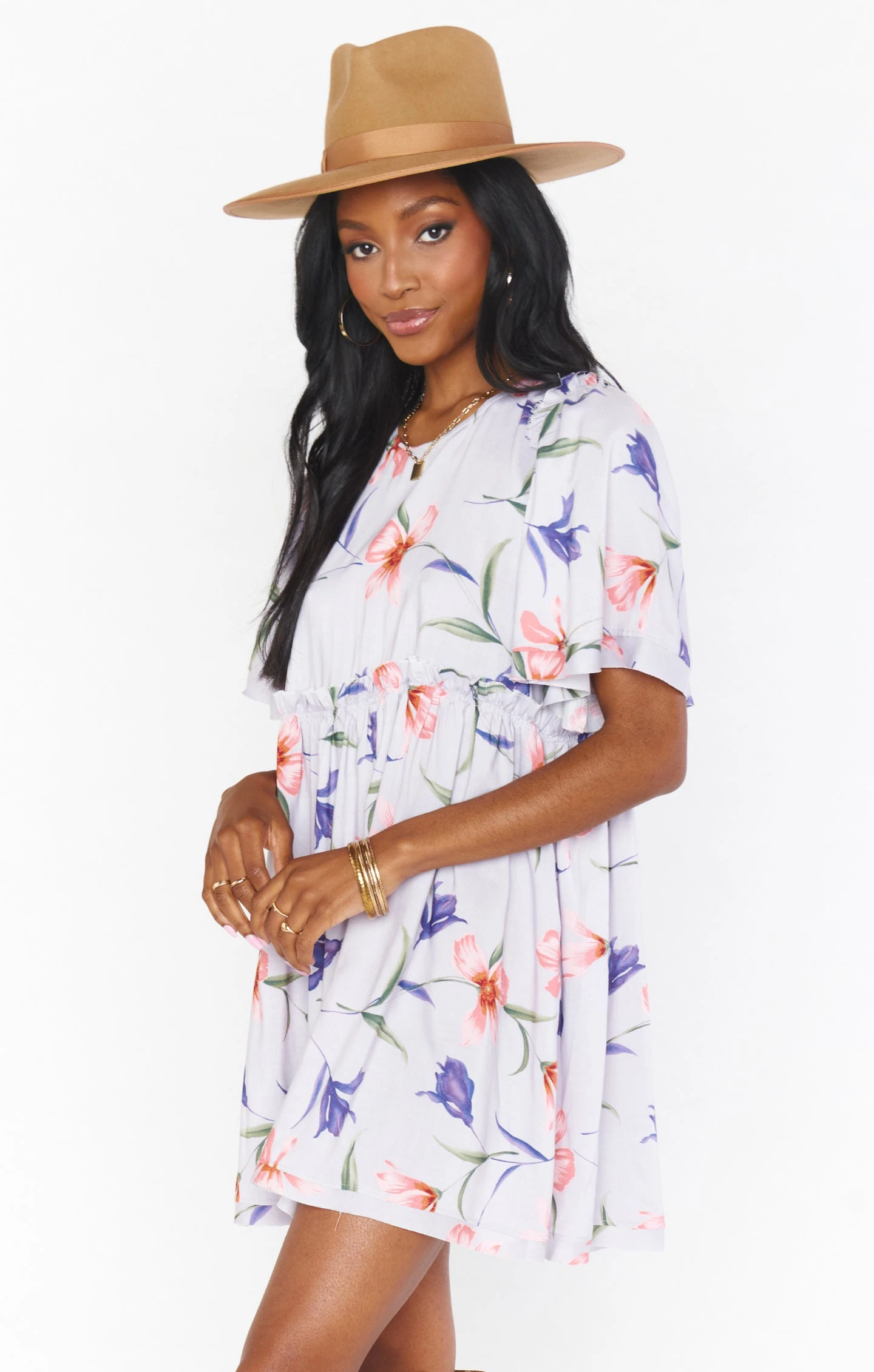 Trust us, this will be your favorite floral mini dress to throw on for any occasion! It has a high neck with a babydoll silhouette, ruffle detailing, and large flutter sleeves for an effortless and adorable look. Pair with high boots to dress it up or sneakers for a day on the town.