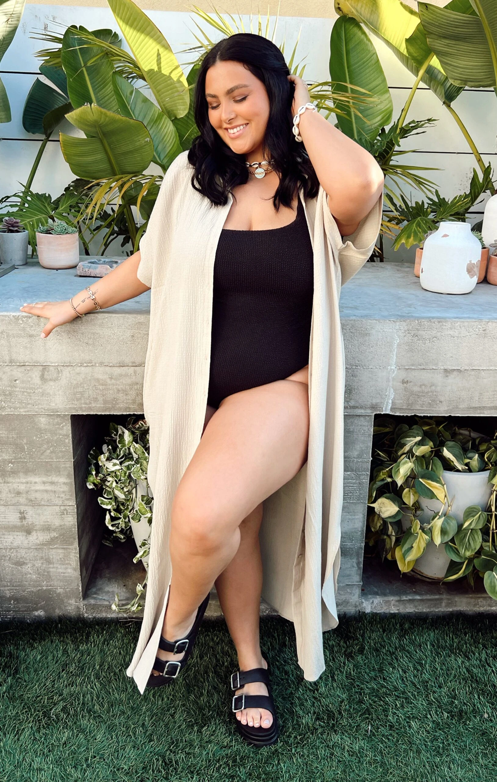 Beach vacay babe in this tan button down dress. Wear it closed or open and flowy! Pockets, a collar and side slits elevate this beyond your typical coverup.