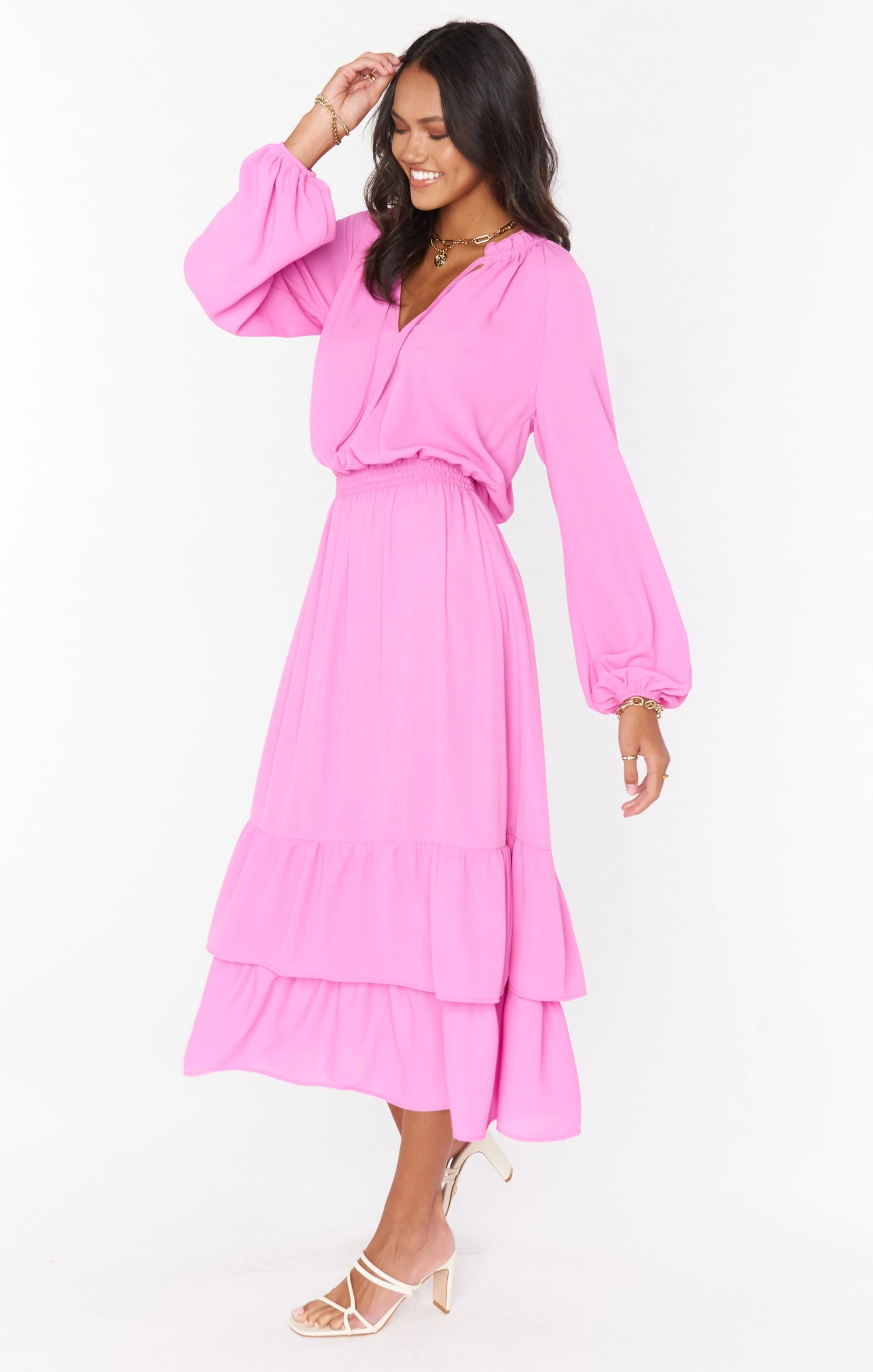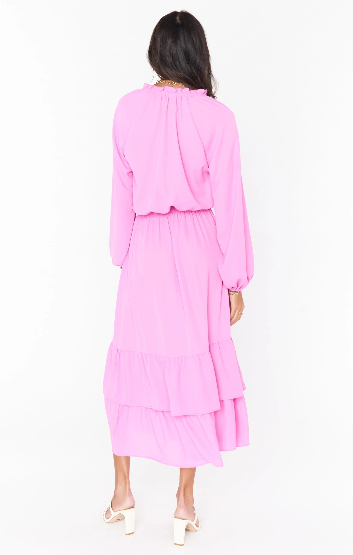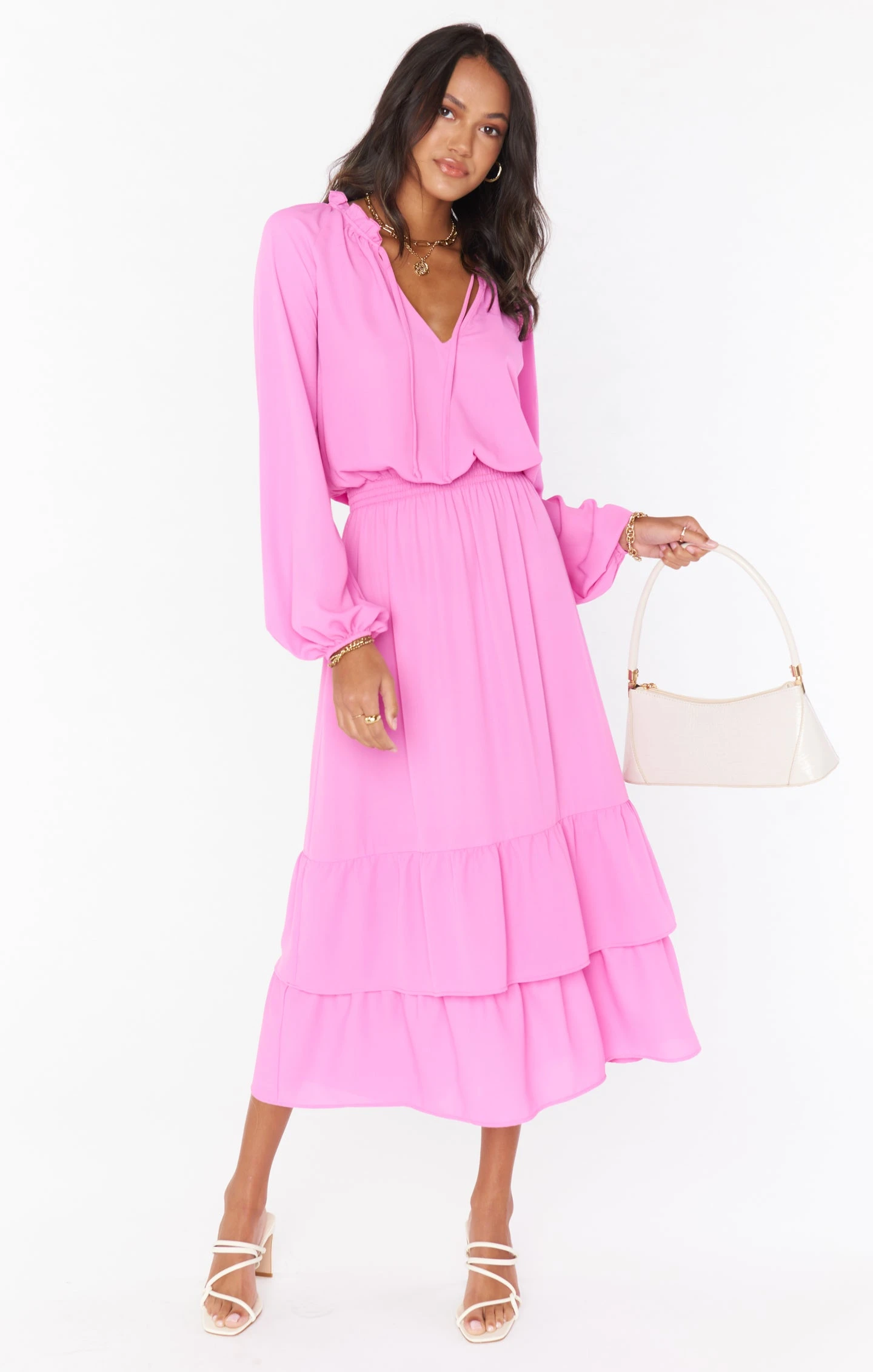 Flouncy and feminine, this pink midi is your new closet staple. A boho v-neck and draped sleeves meet an elastic waist band to show off your figure. Tiered and sheared ruffles elevate this number so you can bop around town in platform sandals or throw on heels for your weekend events! Bonus points for pockets.