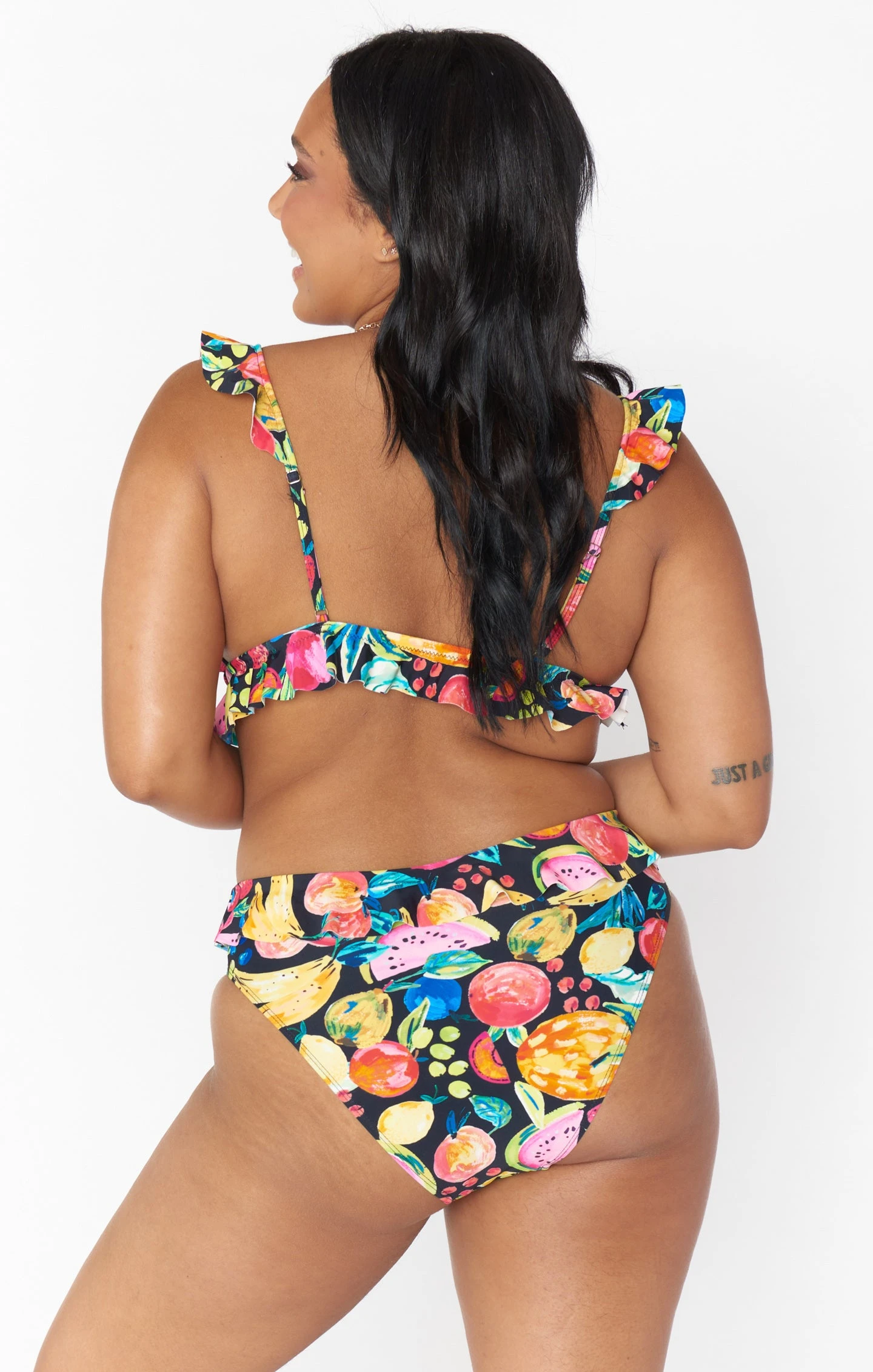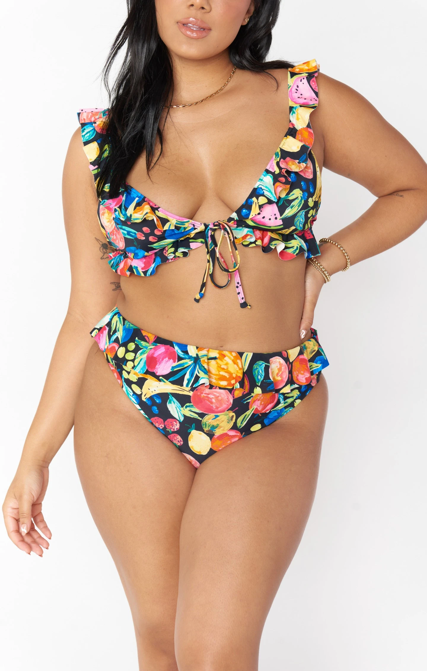 The Carolina is a playfully flirty fruit bikini top with a fluttery trim and flattering front tie. Pair her with sunnies, sandals, and her matching Island Ruffle Bottoms in Fruity Tango to complete the perfect beach day look!