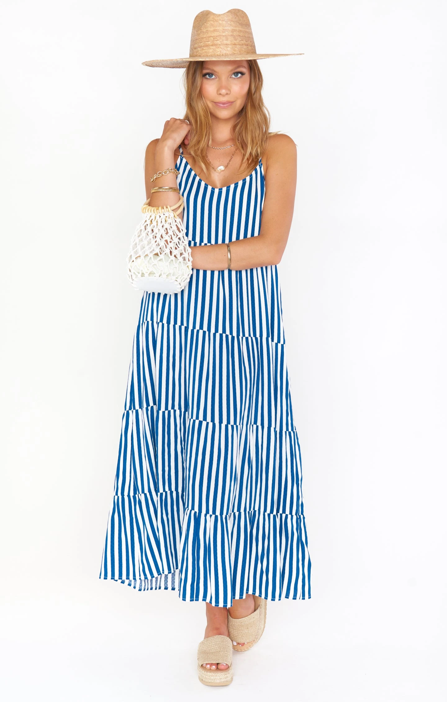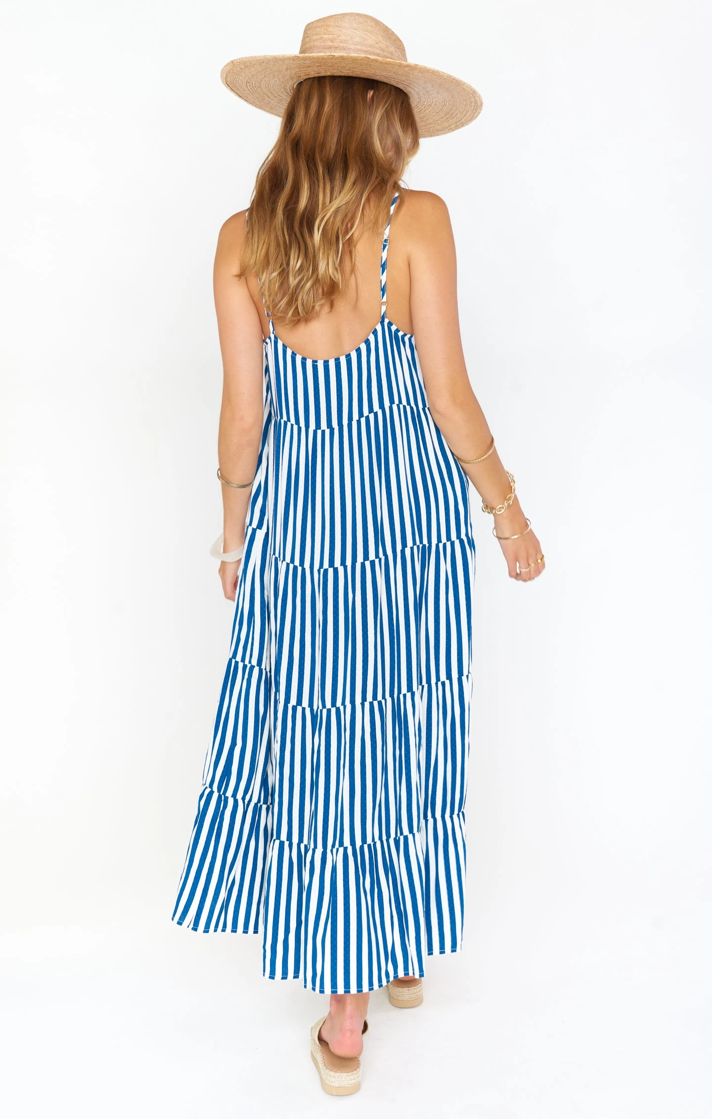 This favorite strappy dress is now in a maxi length! The Caroline Maxi Dress is a vacation must have with her breezy blue and white striped fabric, adjustable straps, and perfectly tiered flow!