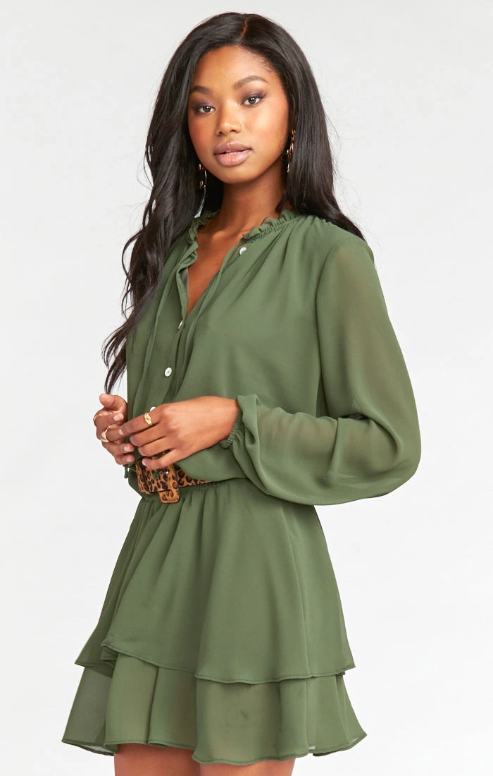 Frilly and flirty mini dress. This dress features a front button and tie closure and elastic lining at the wrist and waist. Twist and turn all day and night in the new Channing!
