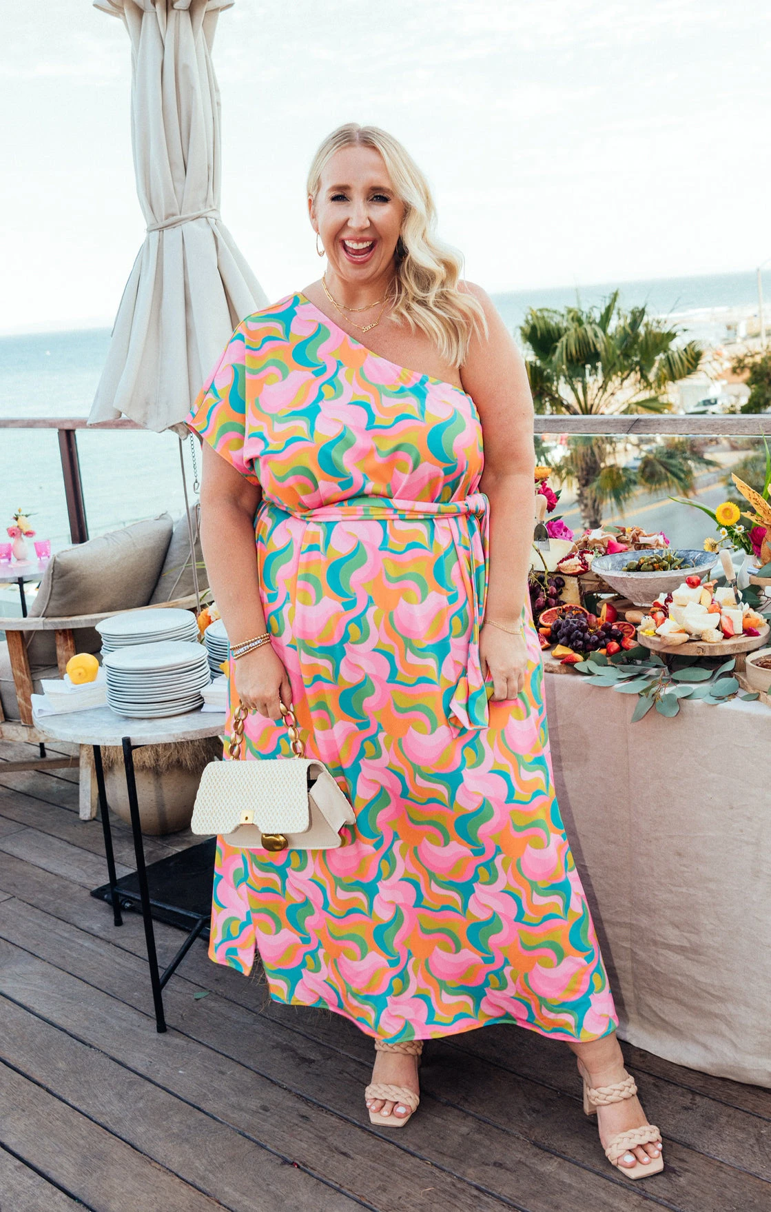 This is a dreamy maxi dress that every beach girl needs in her closet! A peakaboo one shoulder and flowing silhouette in a lightweight and breezy fabric make it perfect to wear both as a beach cover up or to an elevated event.