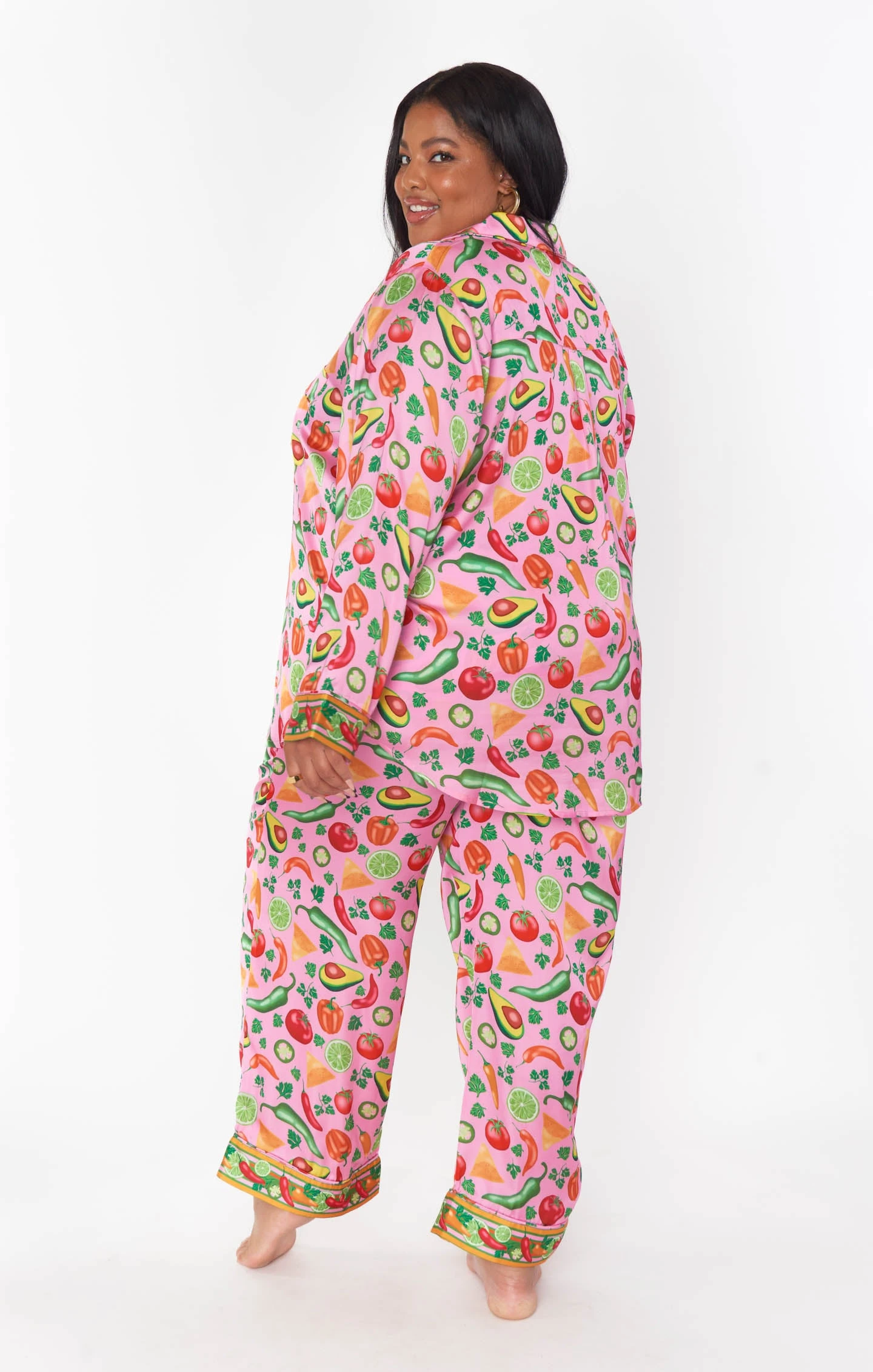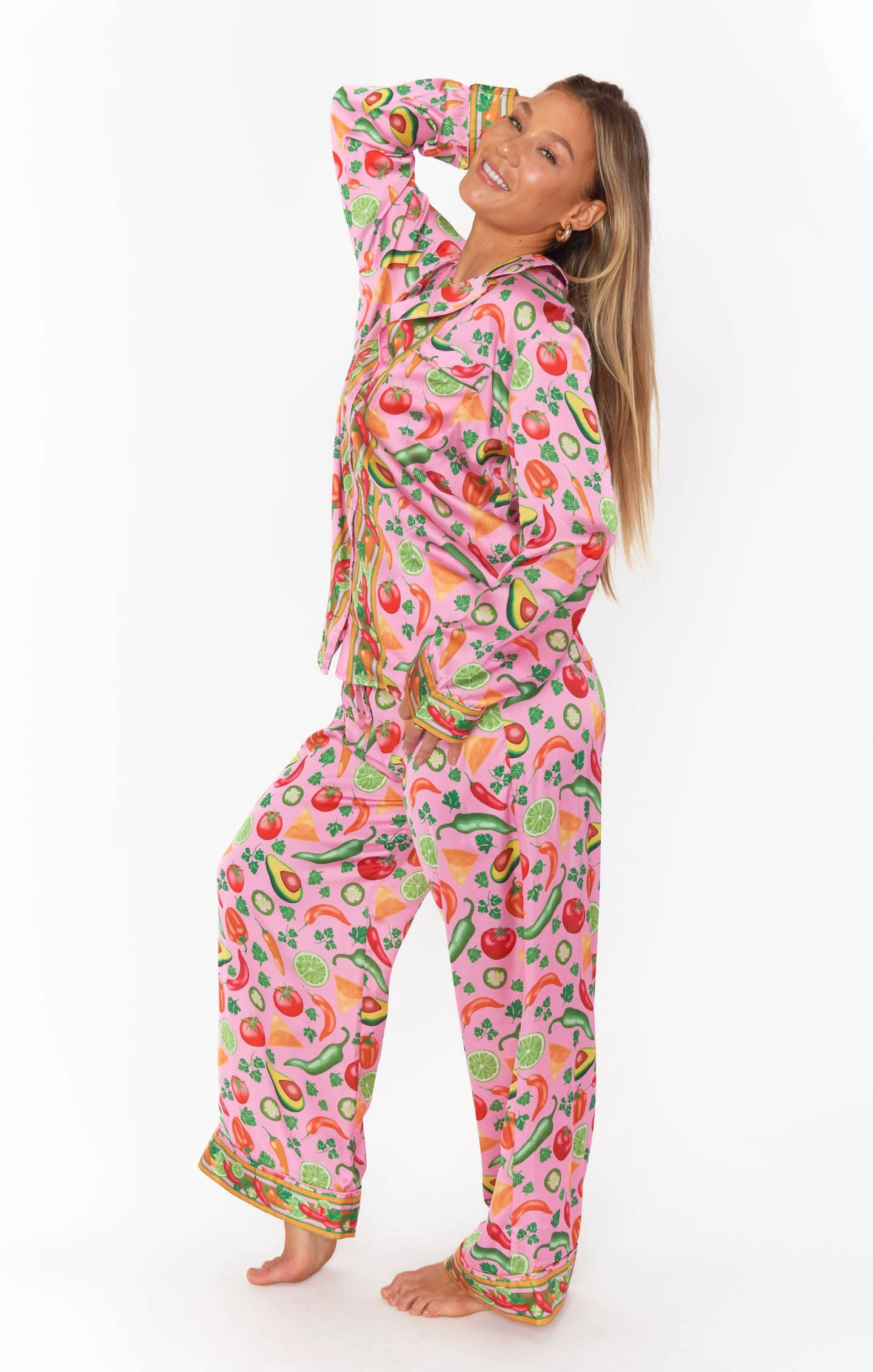 Sleep tight in these super silky button down pajamas! Sold as a set, these cheeky queso pjs have a drawstring and elastic waist.