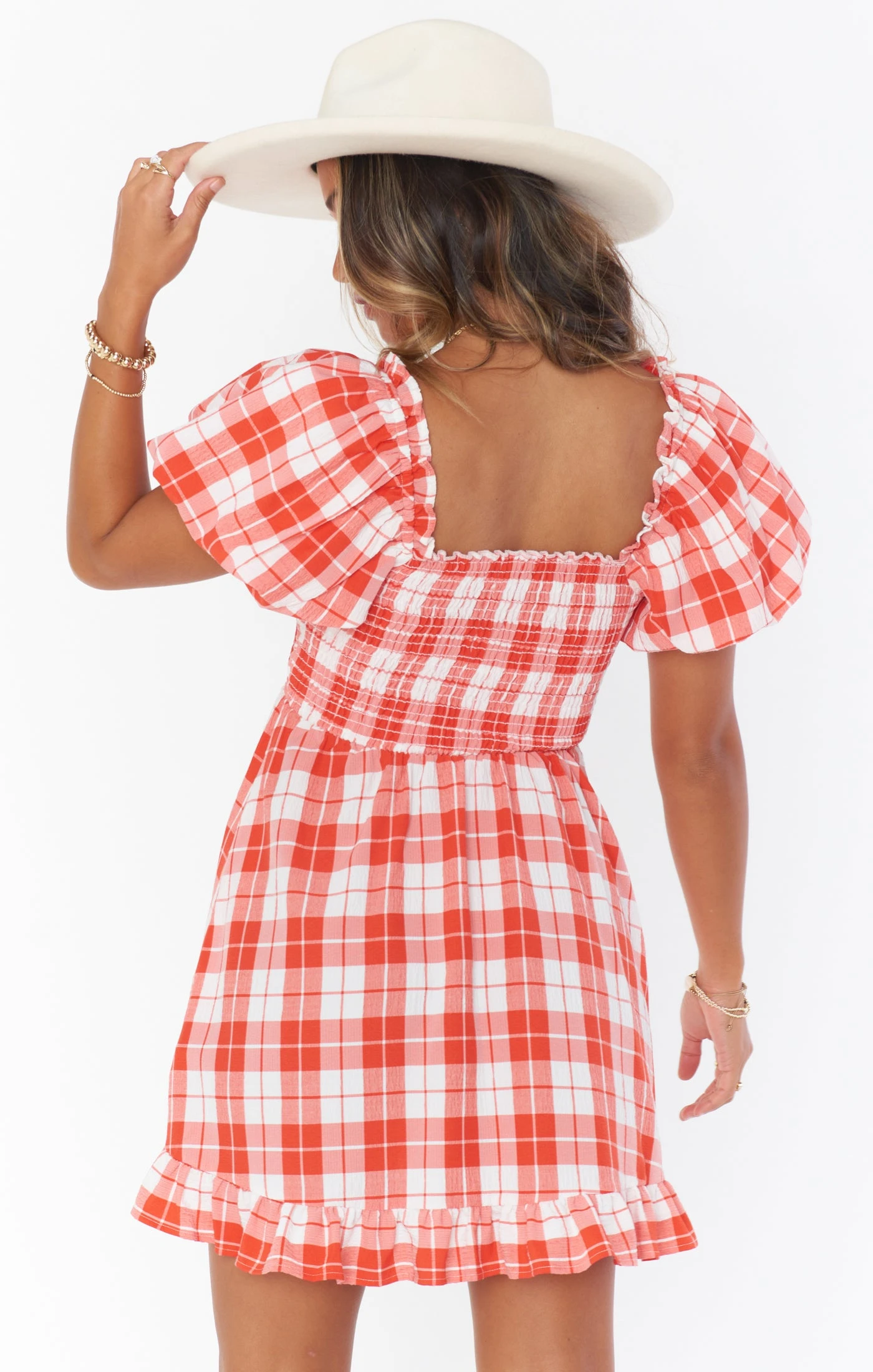 Country cutie in this red and white plaid mini dress! A flirty poof sleeve meets a smocked bodice and square neck. A ruffled bottom hem completes the look!