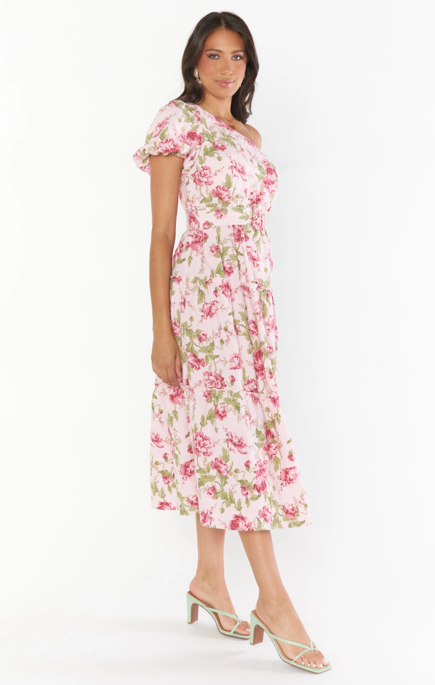 Something perfect for you! This one shoulder blush floral dress is the ultimate midi for the season. Tiers with shearing, a puff sleeve and retro belt to highlight your waist, this classic silhouette is packed with style.