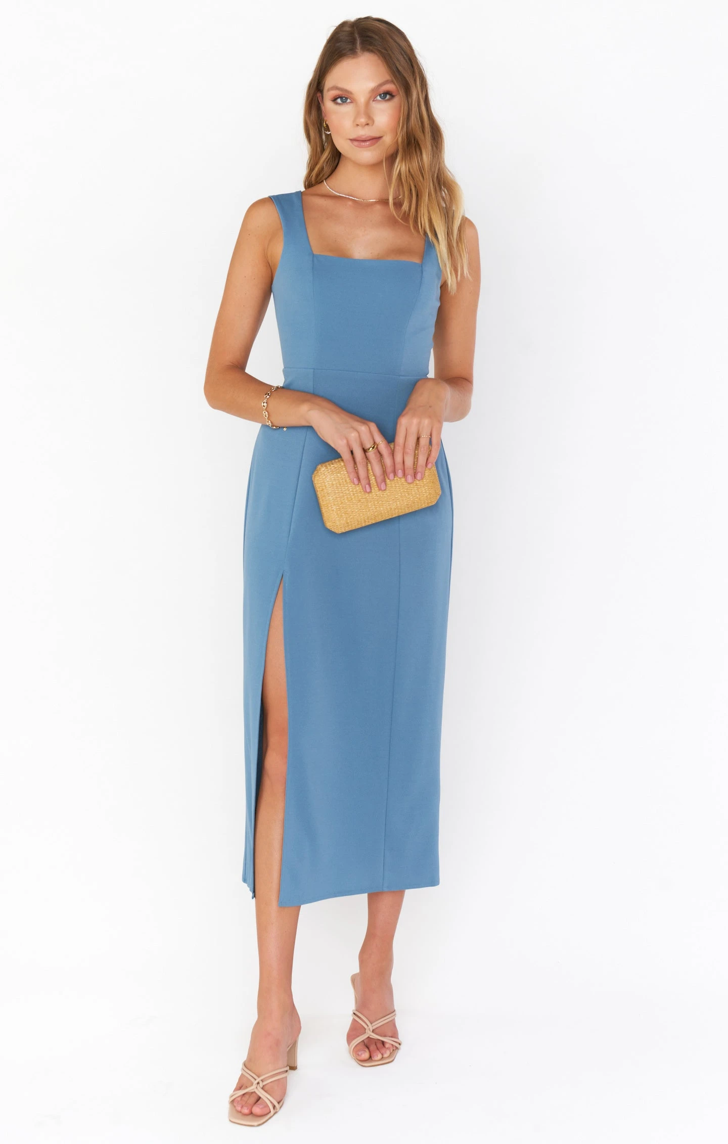 This fitted midi dress is as flattering as it is comfortable. Soft blue stretchy fabric holds in all the right places, punctuated with a side slit. The square neck is complemented with a thicker strap to ensure you feel secure no matter where you wear her!