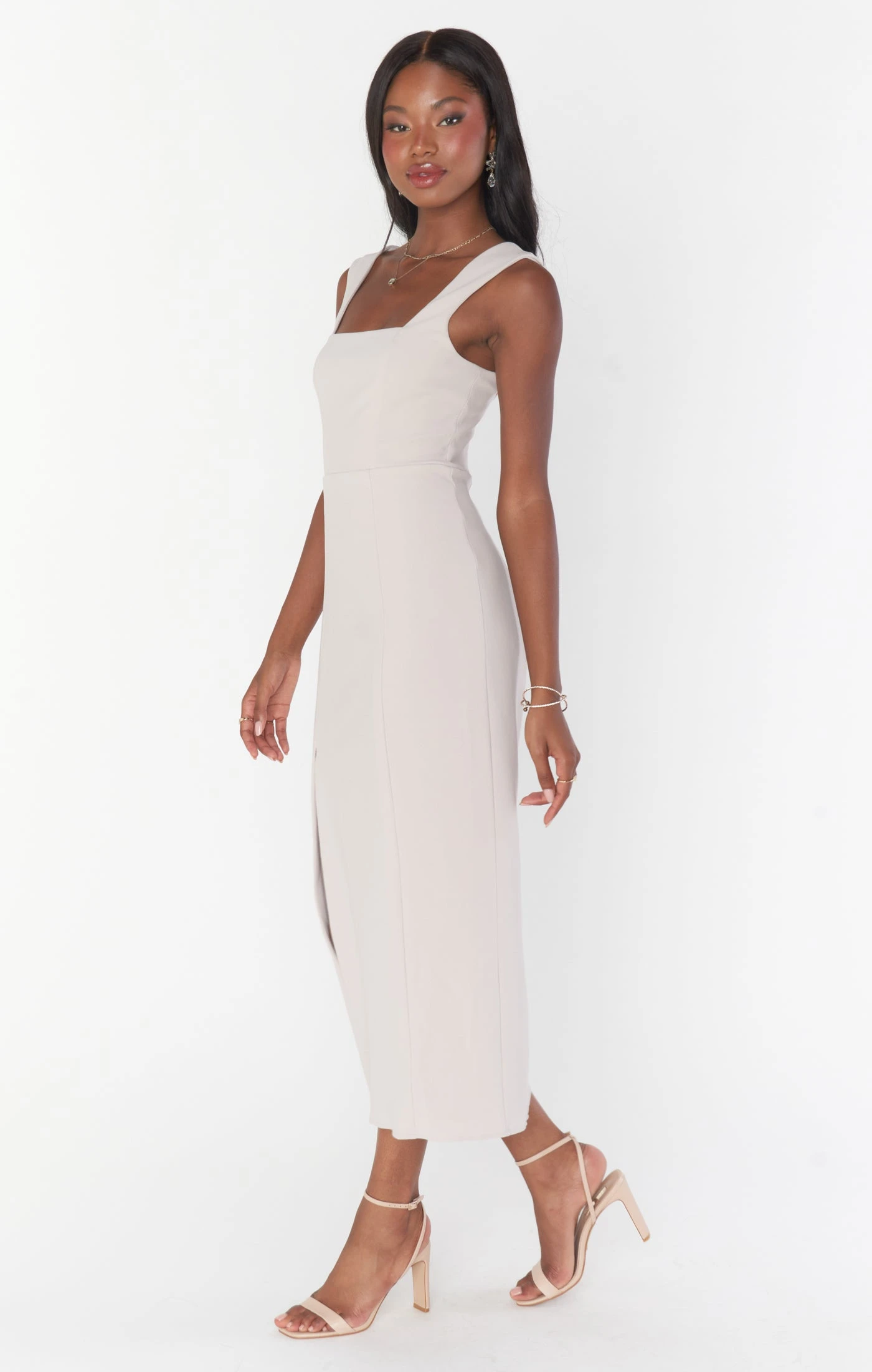 This fitted midi dress is as flattering as it is comfortable. Neutral-hued stretchy fabric holds in all the right places, punctuated with a side slit. The square neck is complemented with a thicker strap to ensure you feel secure no matter where you wear her!