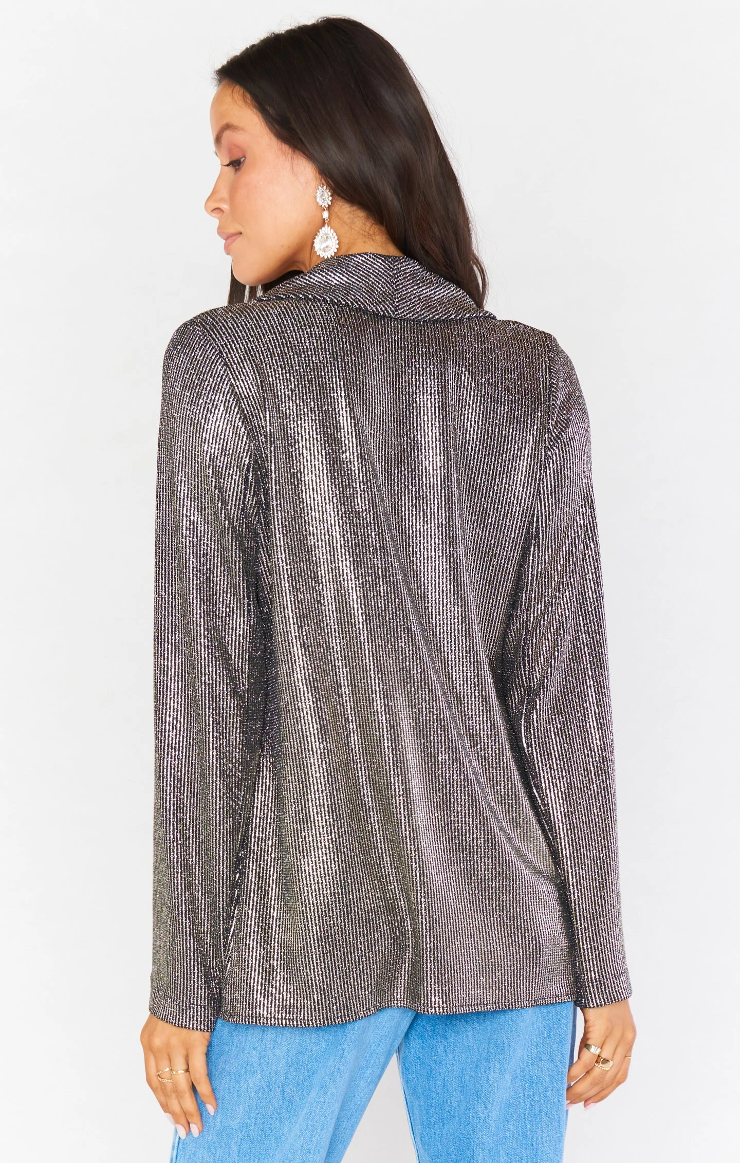Boho boss babe in this disco silver blazer. Stretchy metallic fabric, blousy fit and a button. Wear layered over your fave top with denim or open with the Tempo Tube and Disco Pants for the full disco dance floor look!