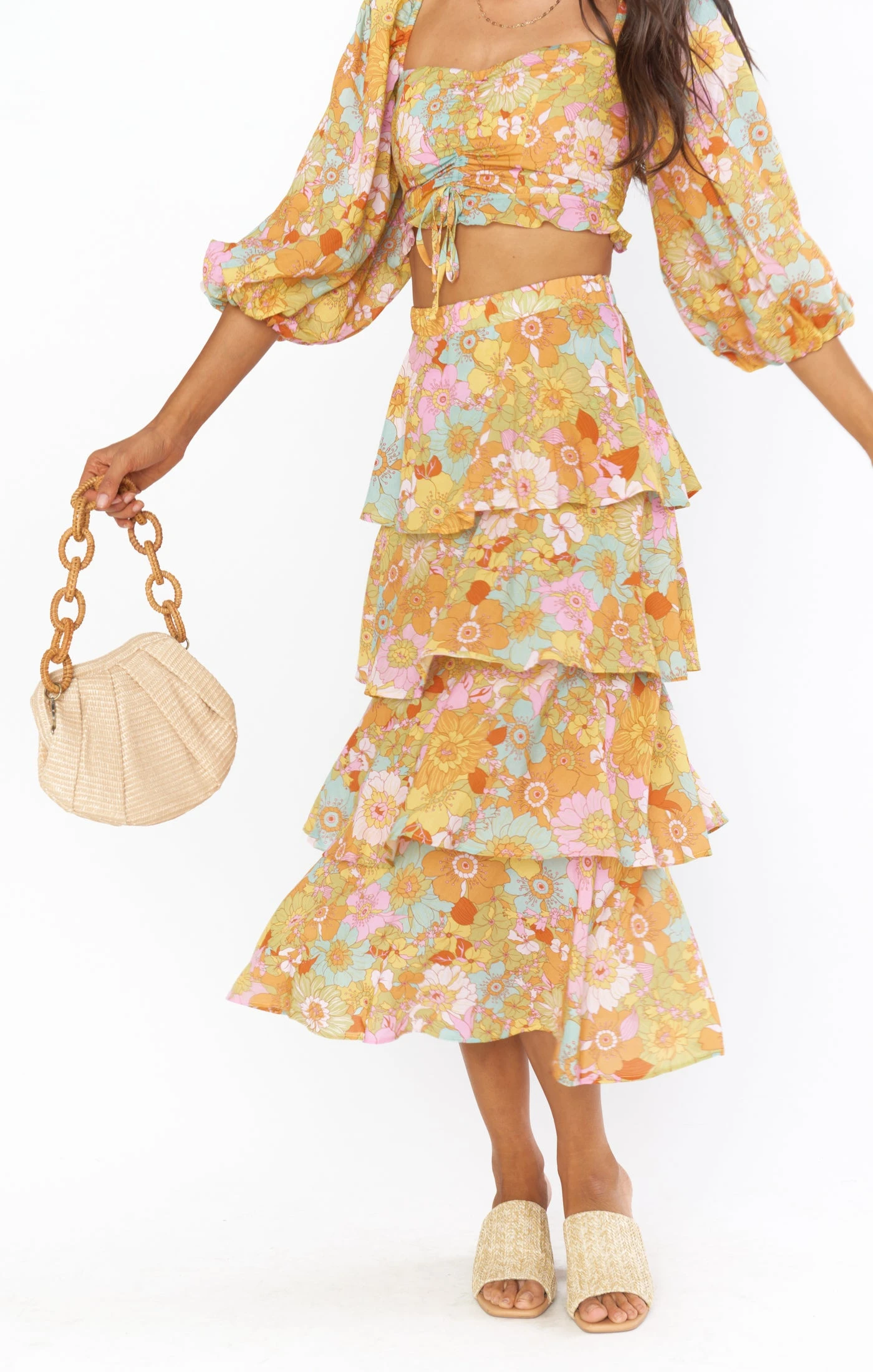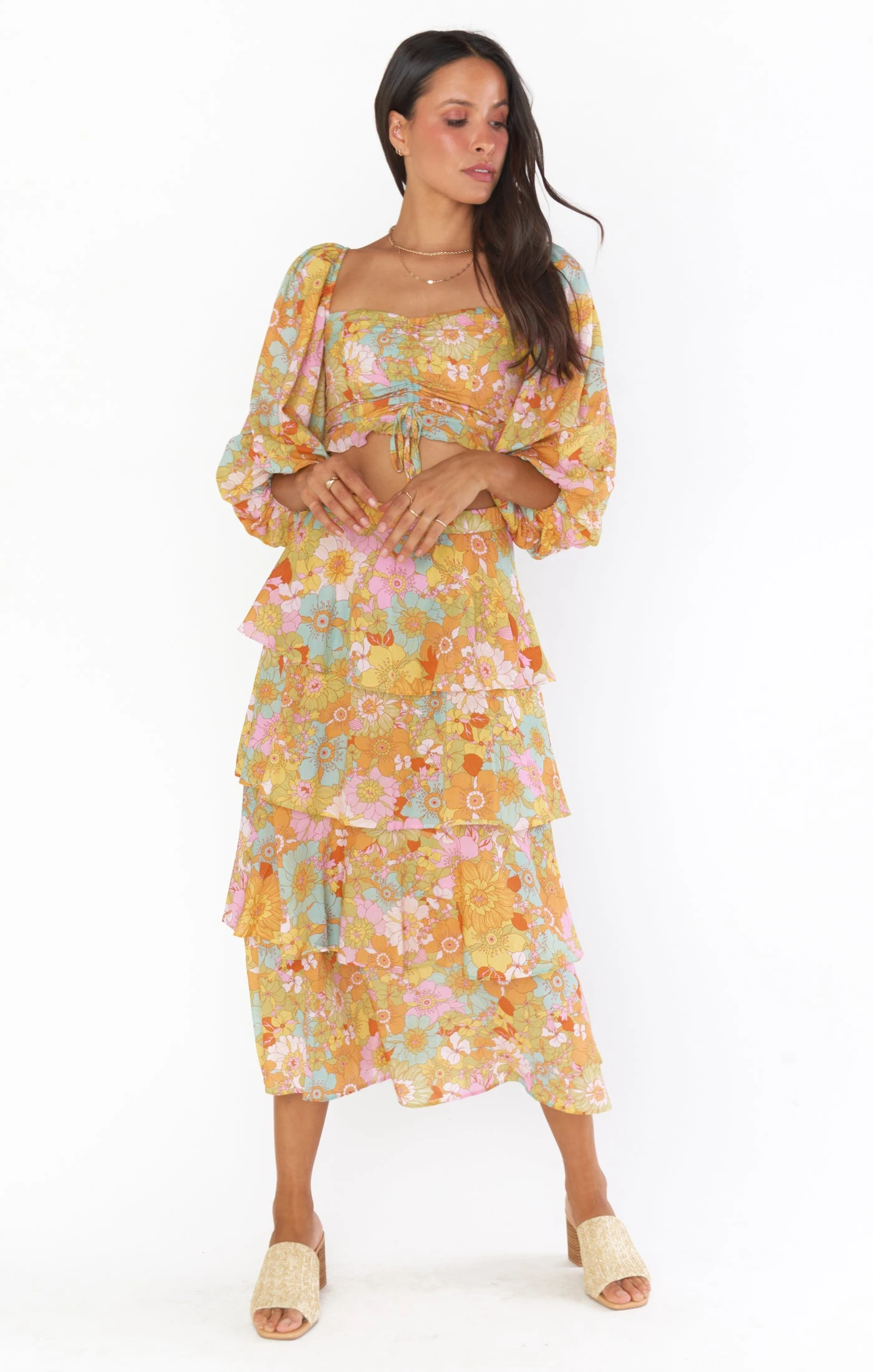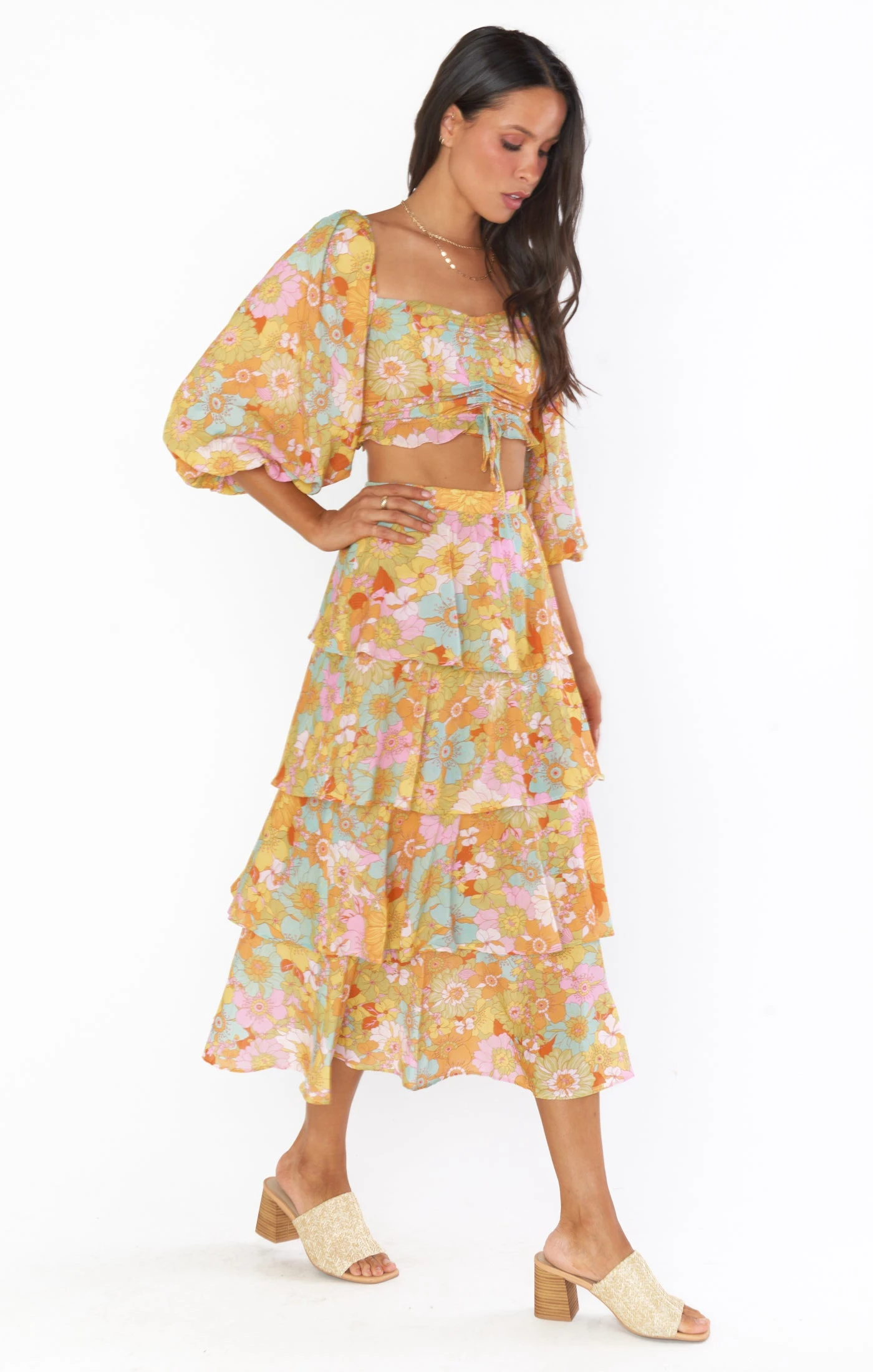 Four tiers of groovy blooms gives this midi skirt a dramatic feel while being super easy to wear! Effortless with the matching Jenna Top for or throw on with a tee and sneaks for brunch. Regardless of where you wear her, this groovy floral midi skirt is sure to turn heads.