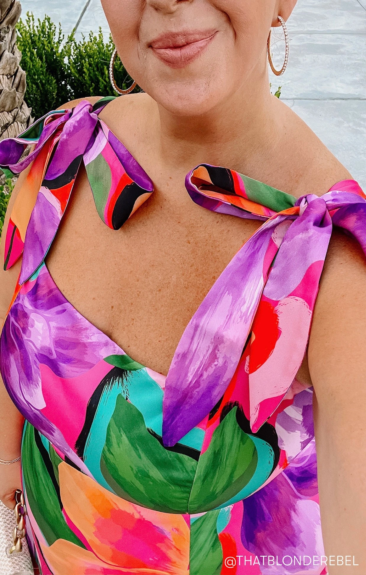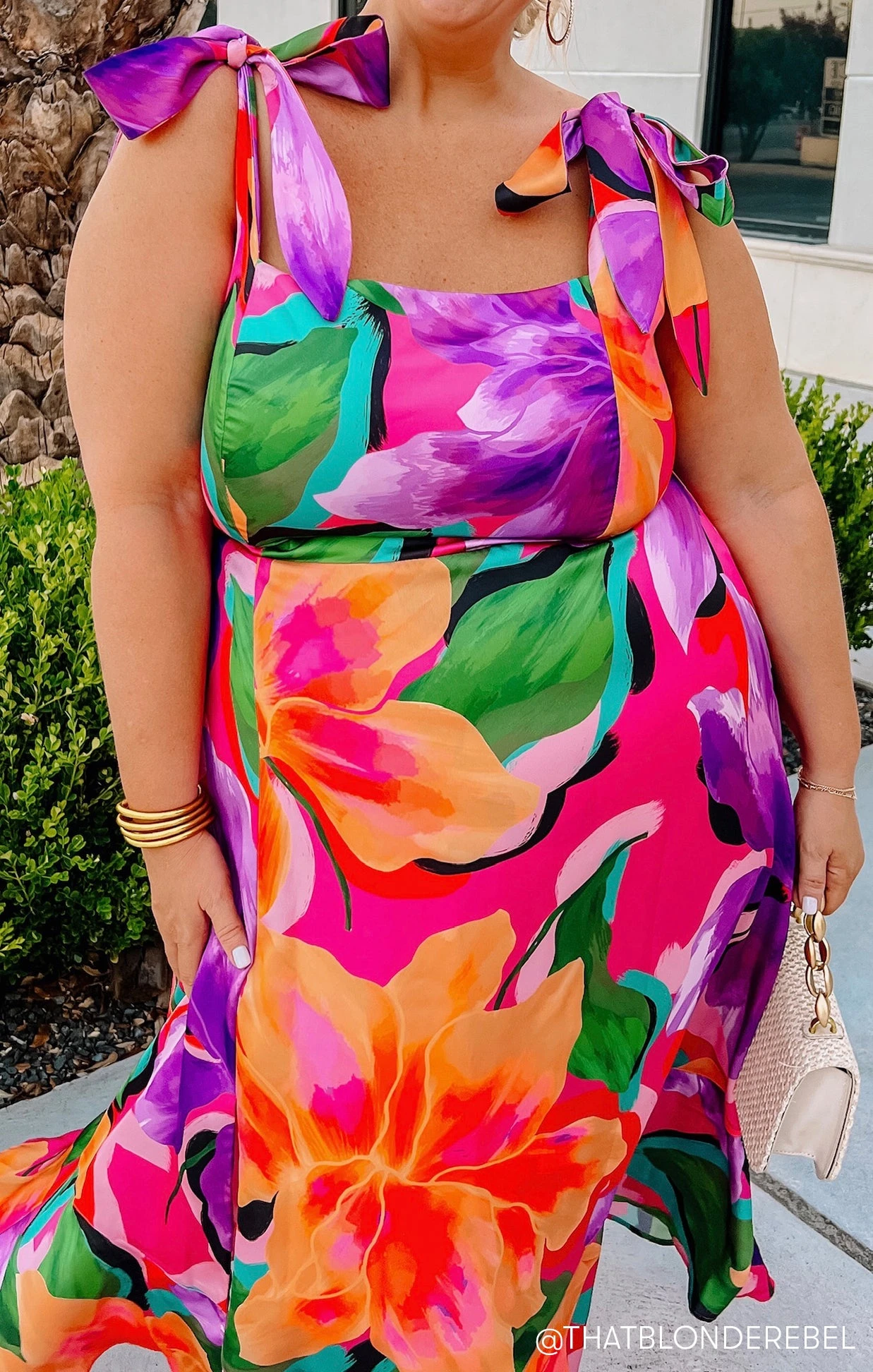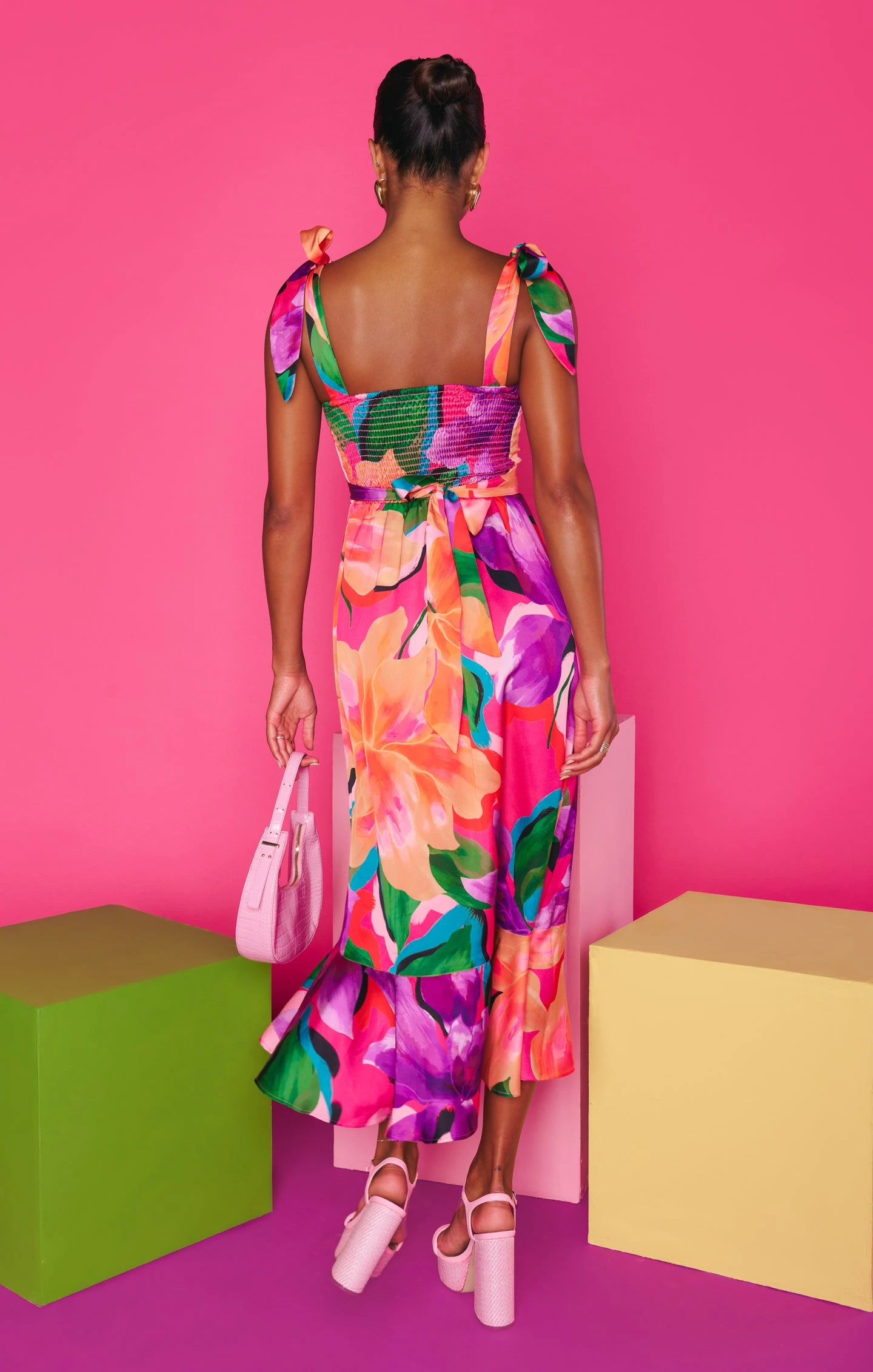This tie strap floral midi dress is filled with charm! Similar to our bestselling claire midi but with adjustable tie straps. A fitted bodice complete with smocking for the perfect fit meets a fun midi skirt with side slit. An effortless midi dress for all your events!