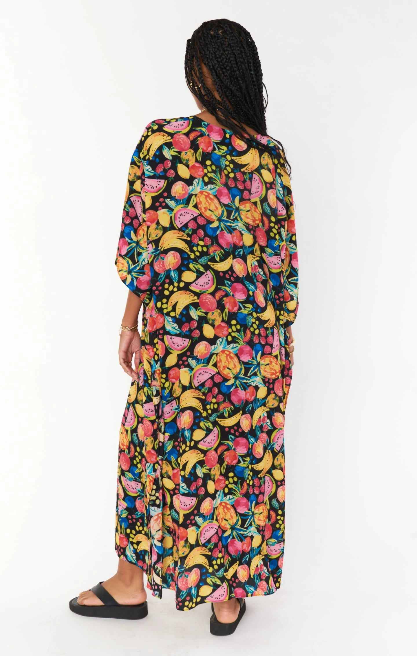 The Hana is a true Mumu OG—her perfectly flowy kaftan body is the epitome of regal. While primarily a swim coverup, she’s chic as can be with a slip dress underneath or even a tight top and denim shorts. Wherever you end up in this oversized fruity printed maxi, you’ll be looking effortlessly riche!