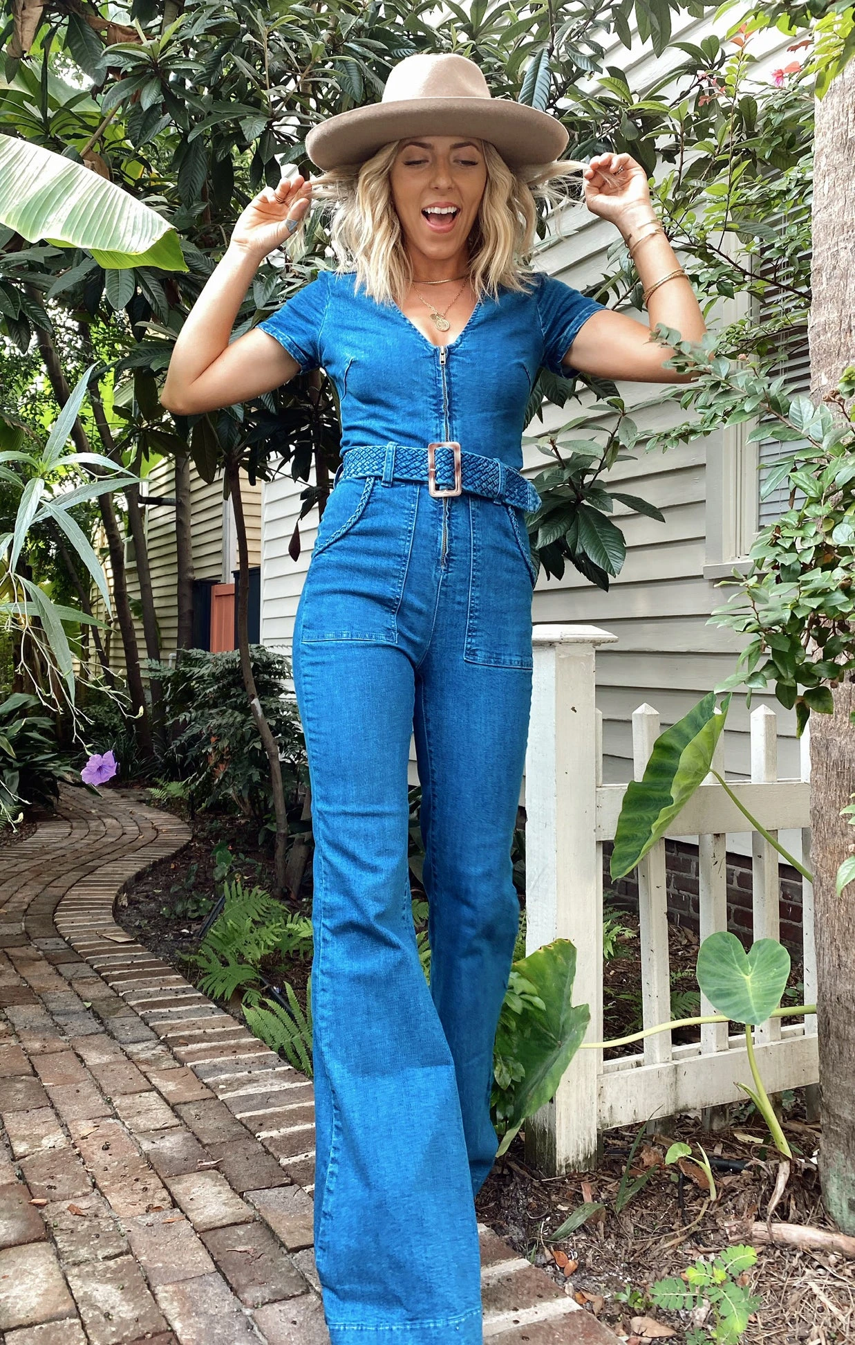 Zip up into this sexy denim jumpsuit. The perfect all in one outfit that exudes confidence! With it’s braided belt, tortoiseshell buckle, exposed zipper, braided detailing on the pockets, and flared leg you will never find another jumpsuit like the Heartland!