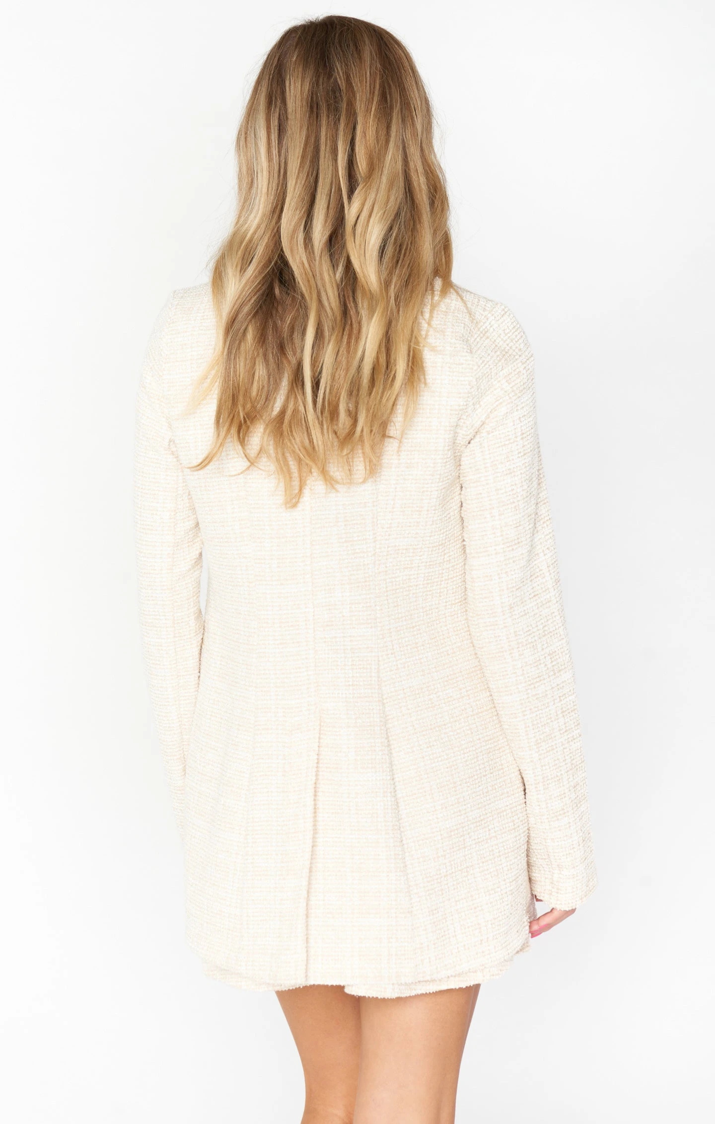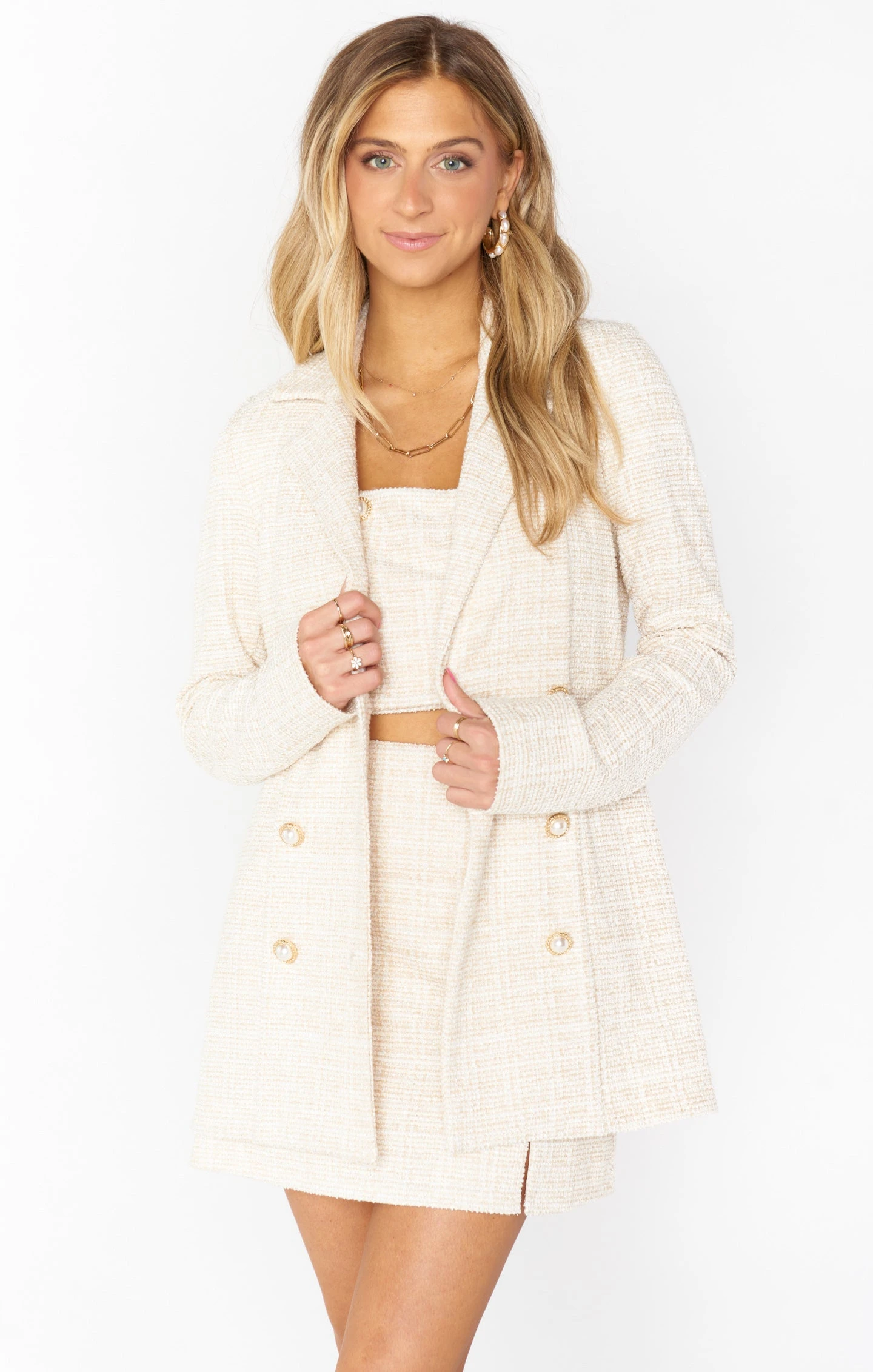Have your Jackie O moment in this structured and chic cream tweed jacket. It is the perfect addition to elevate your closet! It’s all in the details, and this has got it all with perfect pearl buttons and lovely lapels. Pair with the Landon Crop Top and Tyra Mini Skirt for the full look or wear on the regular with your favorite denim.