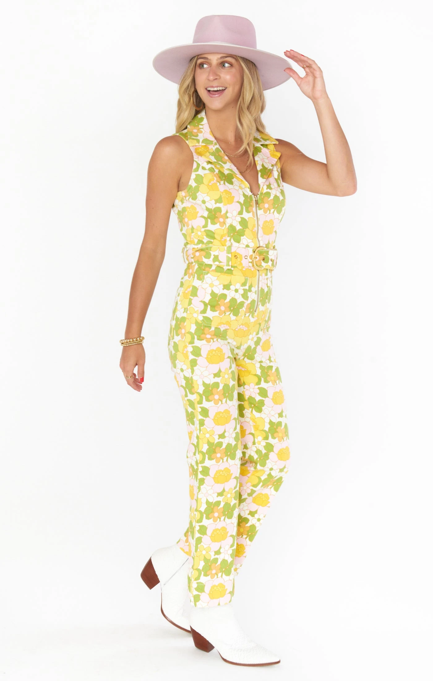 70’s sexy in this floral denim statement cropped jumpsuit! Tight zip up bodice meets a thick retro belted waist and killer wide leg to get you feeling the disco fever. Slight stretch denim will have this fit to perfection.