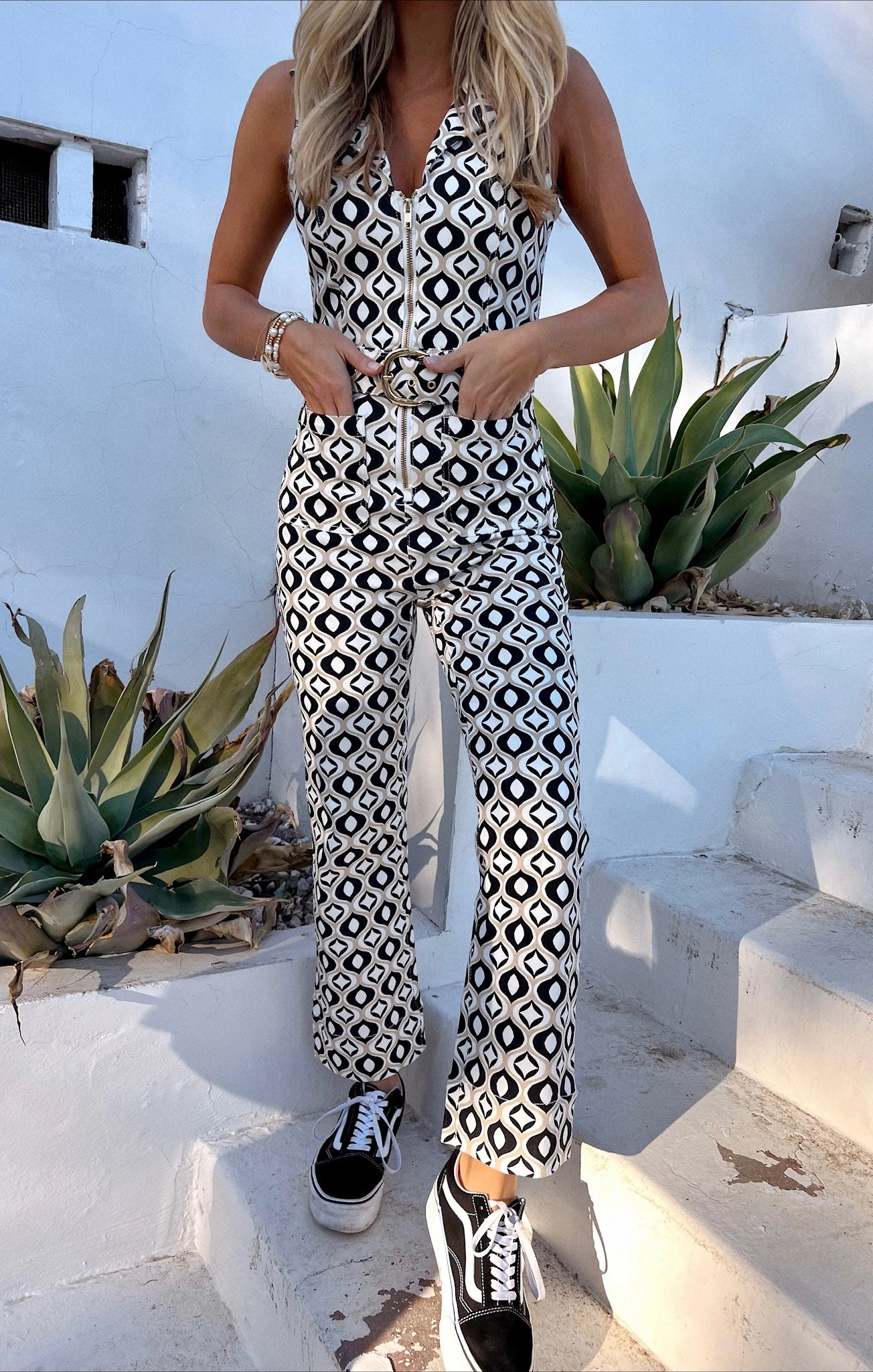 70’s sexy in this geo denim statement cropped jumpsuit! Tight zip up bodice meets a thick retro belted waist and killer wide leg to get you feeling the disco fever. Slight stretch denim will have this fit to perfection.