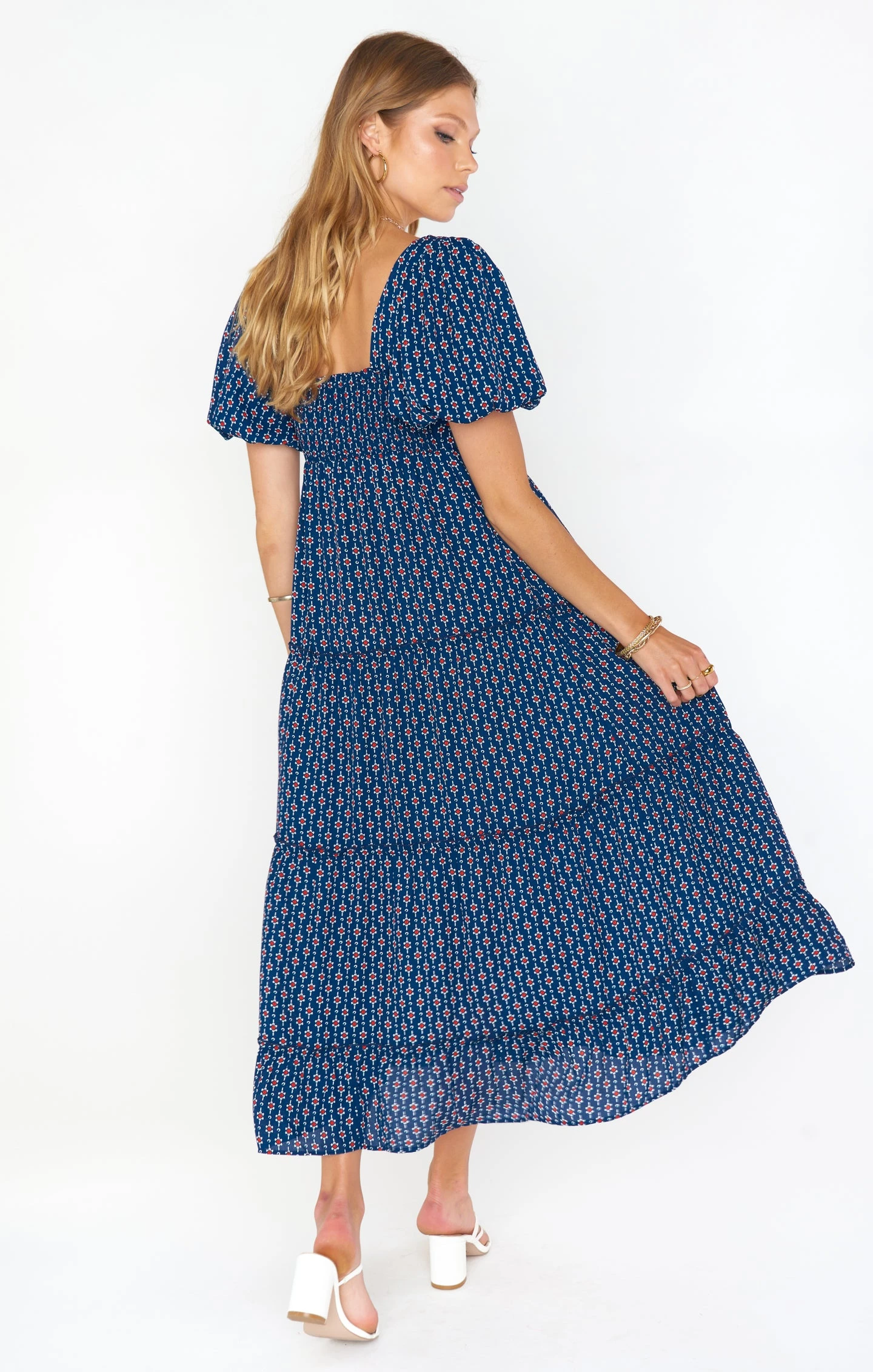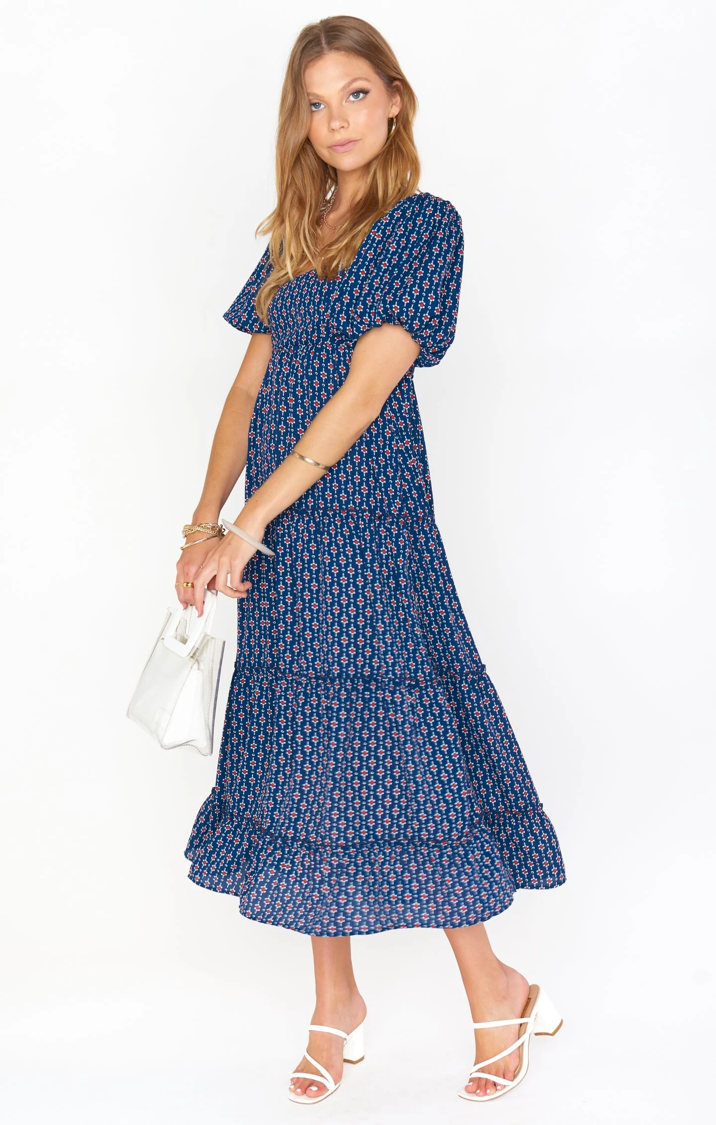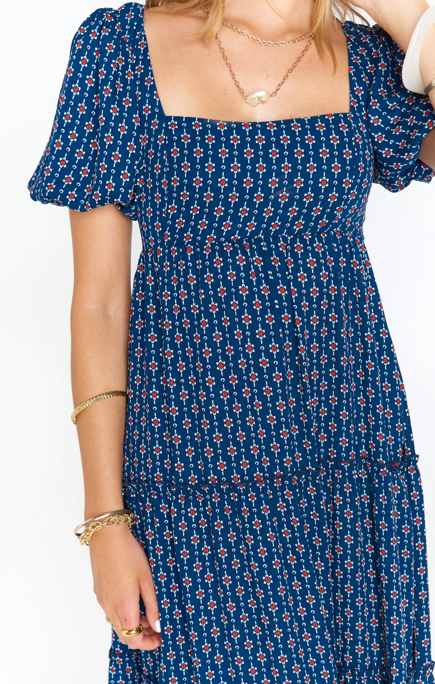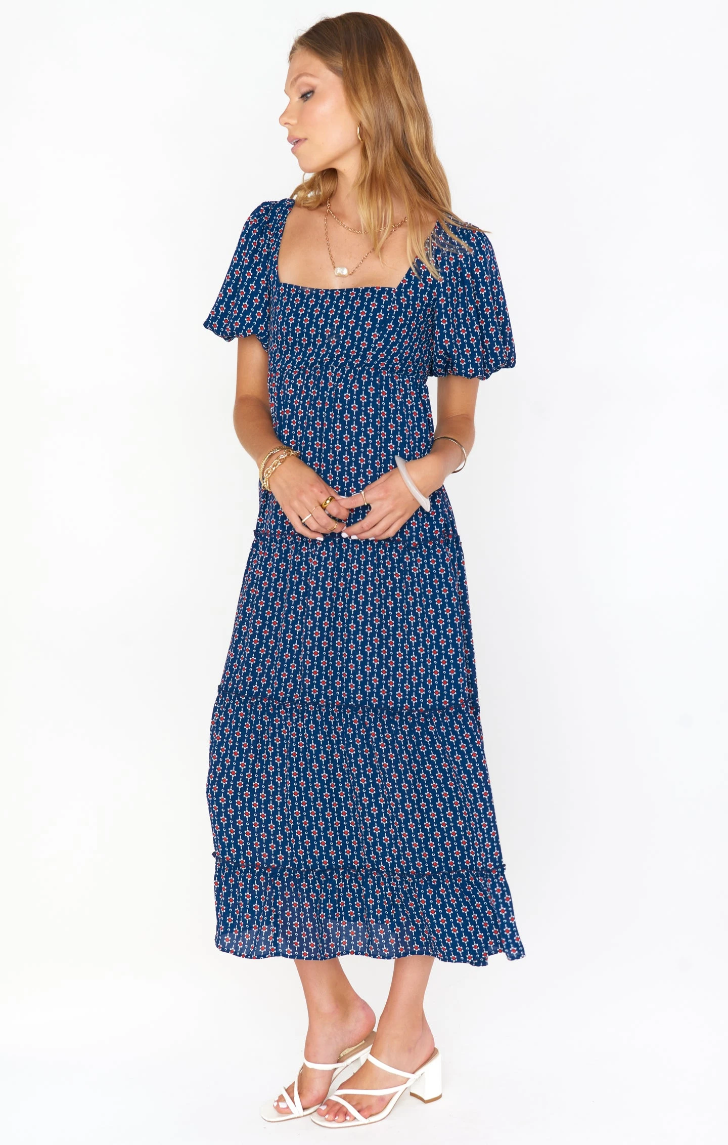 The perfect balance of boho and sophistication, this red, white and blue midi dress will be your new go-to for when you need to up the dress level. It has the golden trio – a flattering square neck, juxtaposed next to a poof sleeve, and fits to perfection with a smocked back. Met with a comfortable flowy skirt, you’re going to love this new midi.