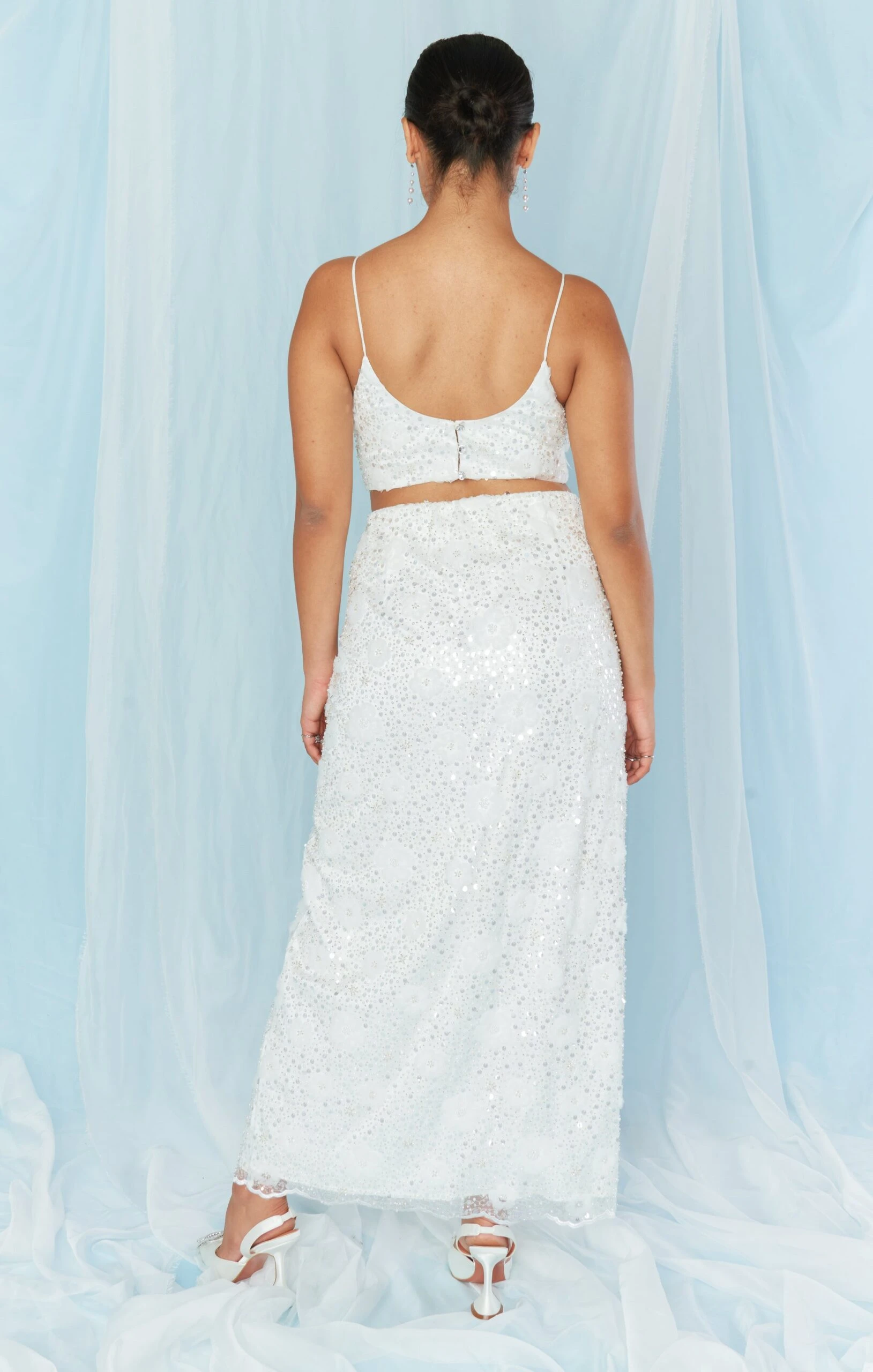You’re sure to shine and radiate with confidence in the Love Letter Skirt! Shiny white beading shimmers across this stunning maxi with a bodycon fit and sultry side slit. Complete the ensemble with the matching Love Letter Top and white accessories.