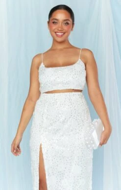 You’re sure to shine and radiate with confidence in the Love Letter Top! Floral beading shimmers across this square neck crop top with a button back detail to secure the look. Complete the ensemble with the matching Love Letter Skirt and white accessories.
