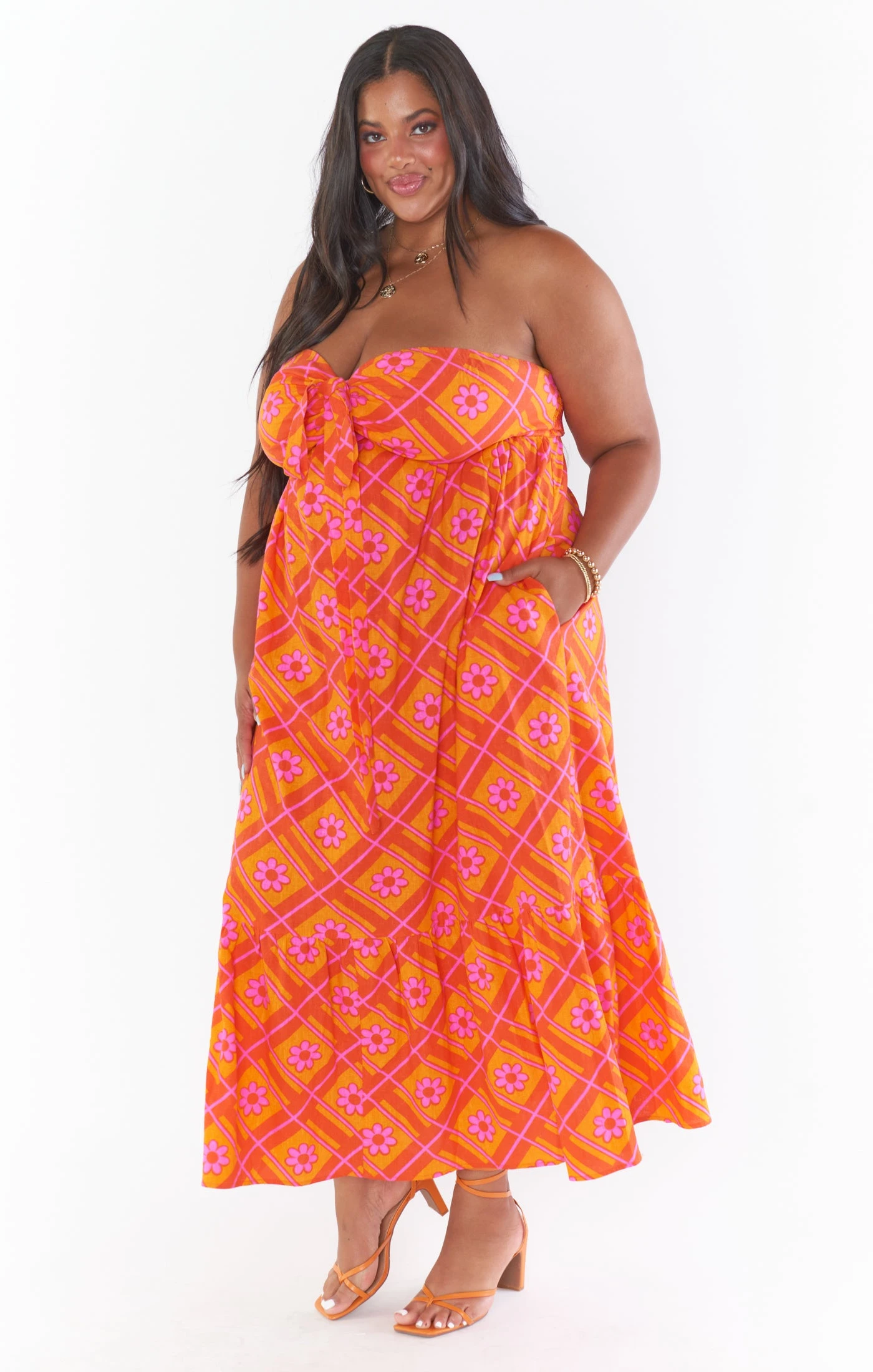 Style meets comfort in this special midi dress. A sweetheart meets halter neckline and a sheared lower ruffle elevate a classic flowing silhouette. Self tie straps and a smocked back ensure a perfect fit.