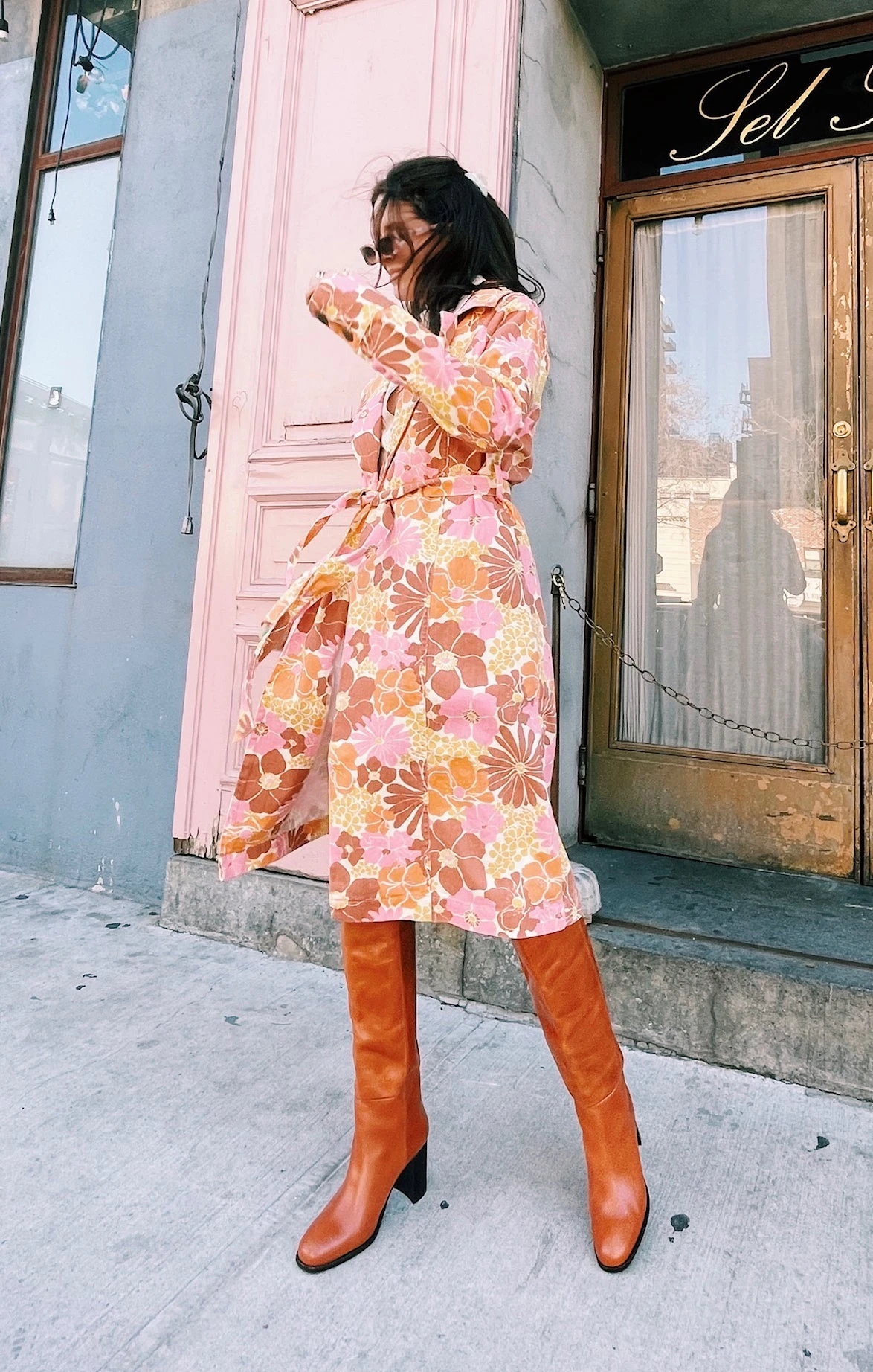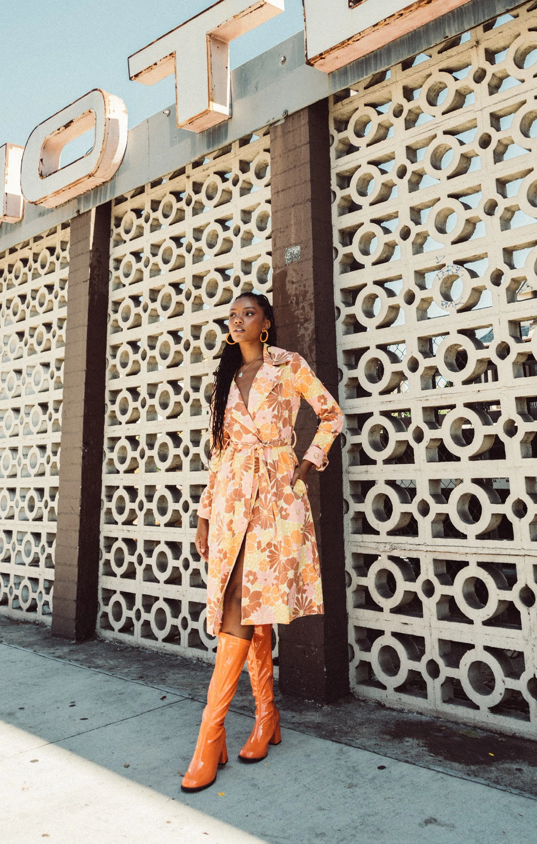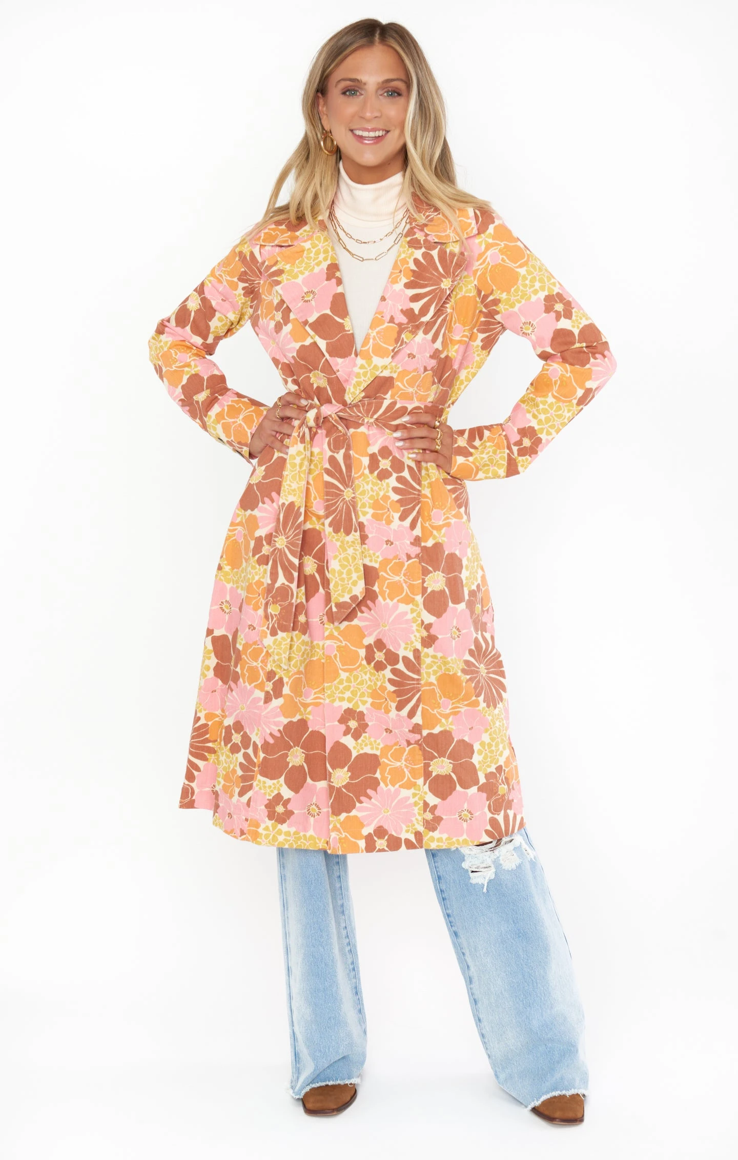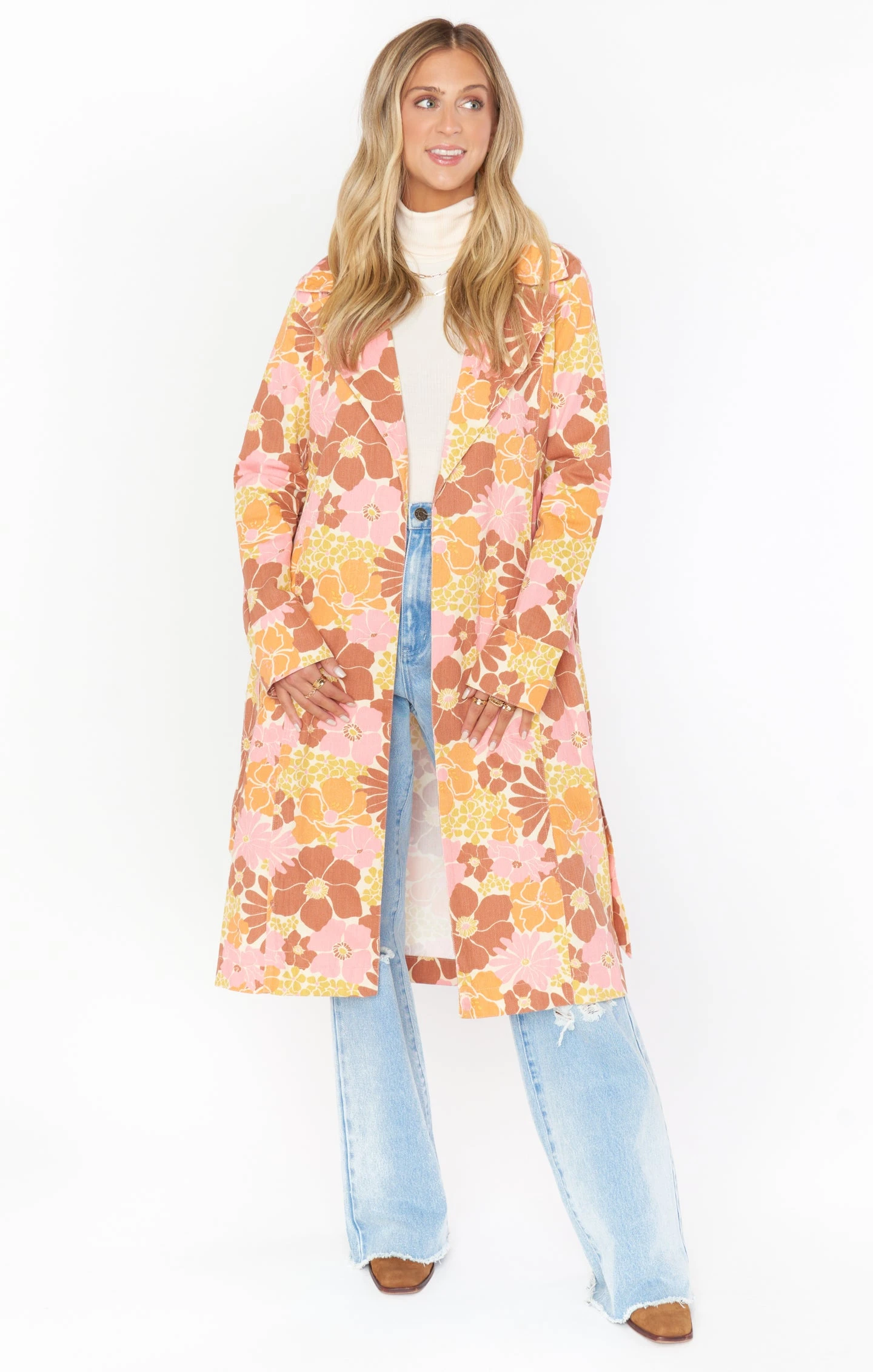 Rock those retro-chic vibes in the Nancy Trench Coat. Orange, pink, and yellow florals decorate rigid denim to create a carefree vibe. A collared neckline meets diagonal pockets before ending at a longline hem. As the weather begins to cool down, throw her over all your go-to looks.