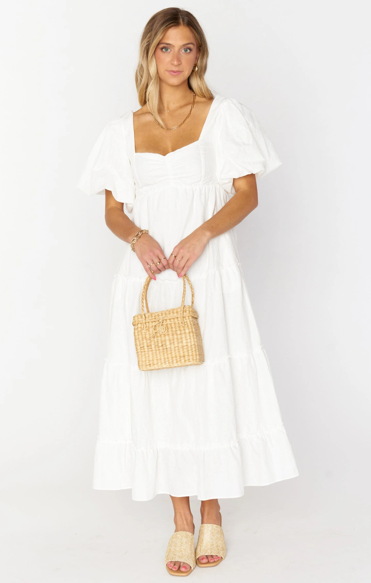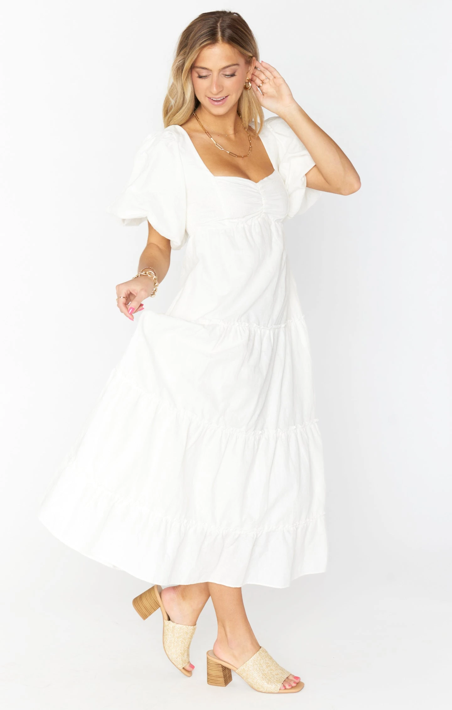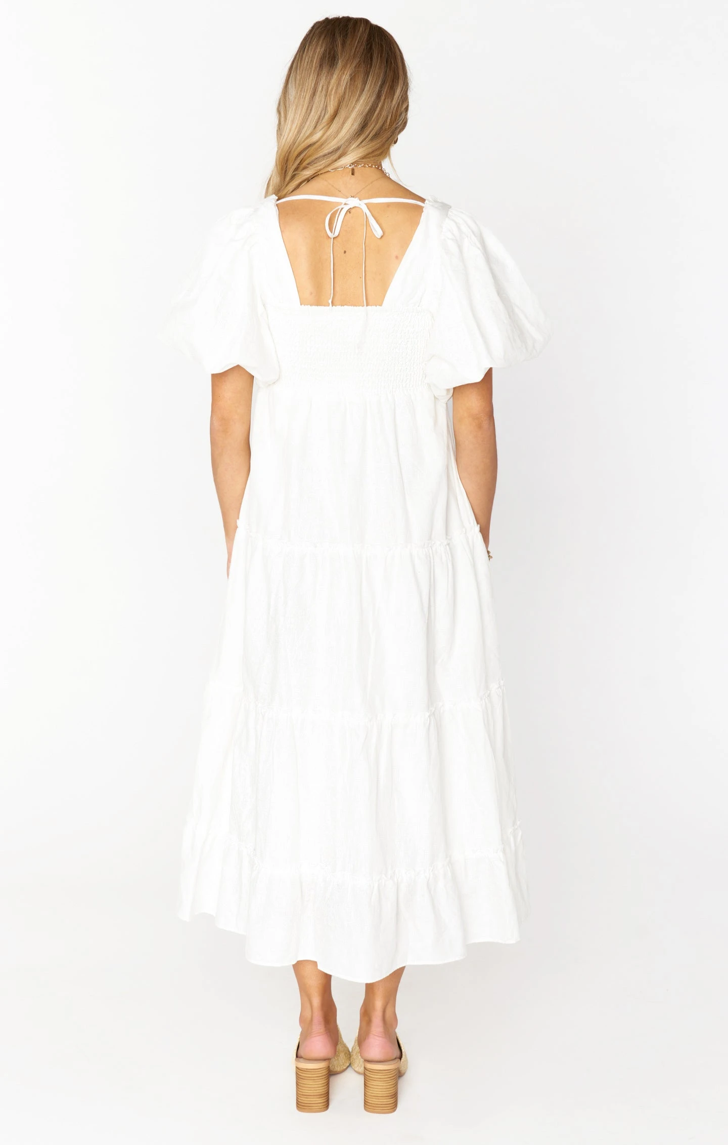 The perfect balance of boho and femme, this white midi dress will be your favorite number for all this seasons events. Darling details with a poof sleeve and sweetheart neckline and fits to perfection with a smocked back and a tie across to keep the sleeves up. Met with a comfortable flowy skirt, you’re going to love this new midi. For extra room in the chest, consider sizing up.