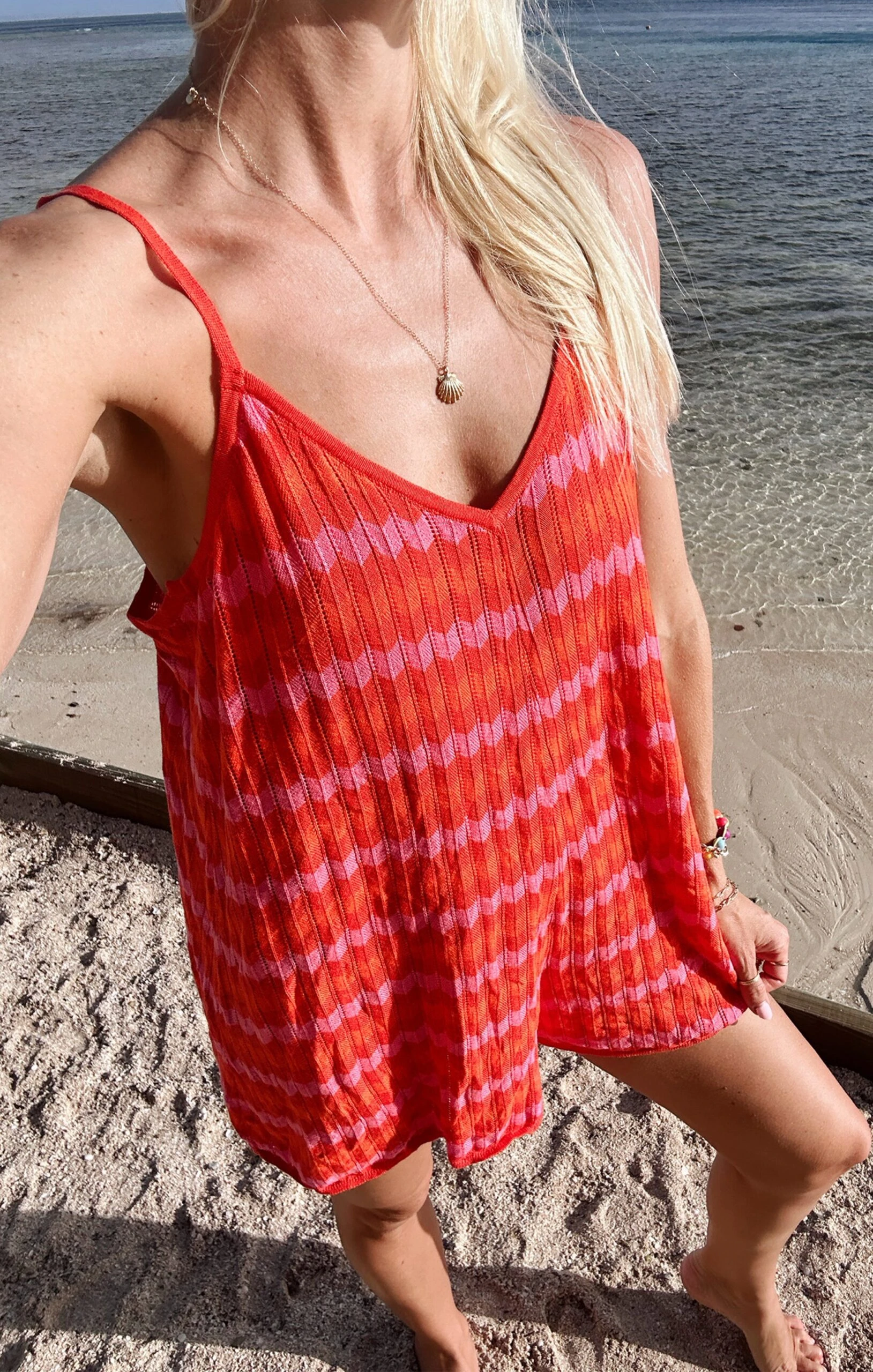 We just can’t get enough of this vibrant red and pink stripe romper and its breezy fit—and neither will you! Has the perfect v in front and a low v in the back to help you show off that summer tan!