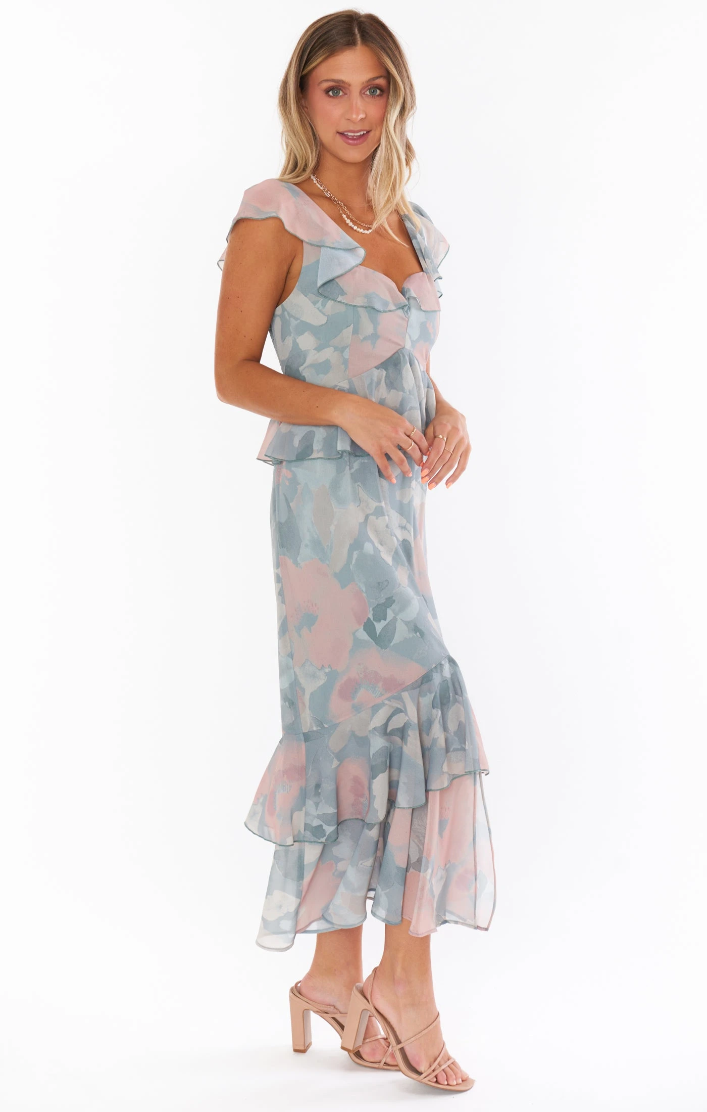 Feminine and flirty, this champagne ruffled tiered midi dress is as romantic as they come. The ruffles and flutter sleeves make this dreamy dress the utmost flattering, and smocked back ensures the perfect fit.