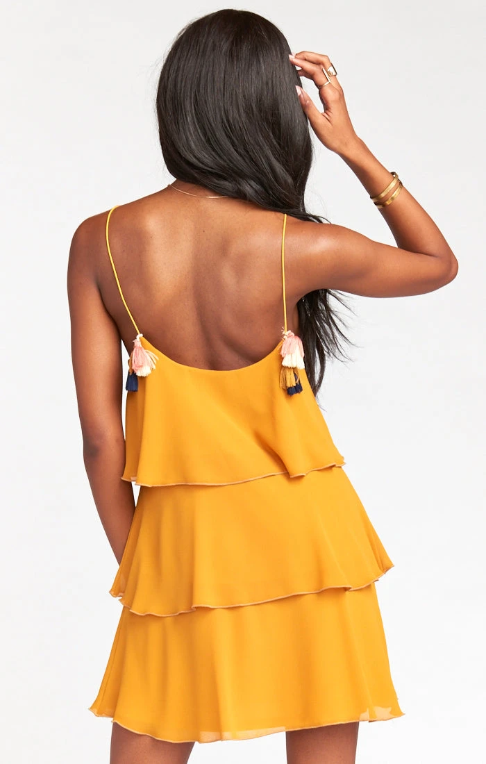 Twist and turn in this triple layer ruffle dress! This dress features a low cut back and elastic straps with tassel detailing.