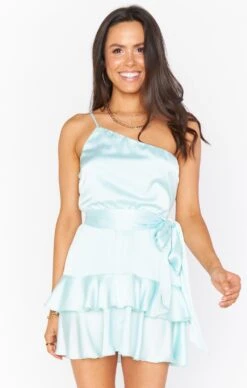 The Superstar is a satin mini dress with a flirty ruffle hem and chic one shoulder neckline. She has a waist flattering removeable tie and flowy silhouette. Pair this little mint dress her with your fave strappy sandals, heels, or booties to complete the look