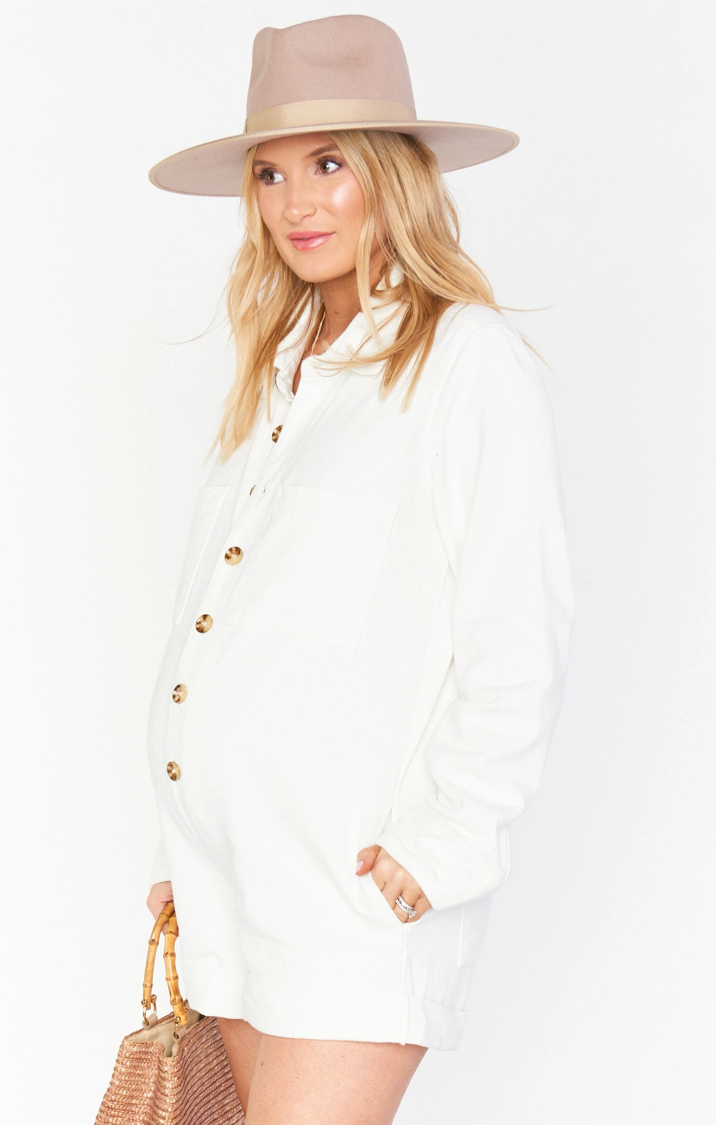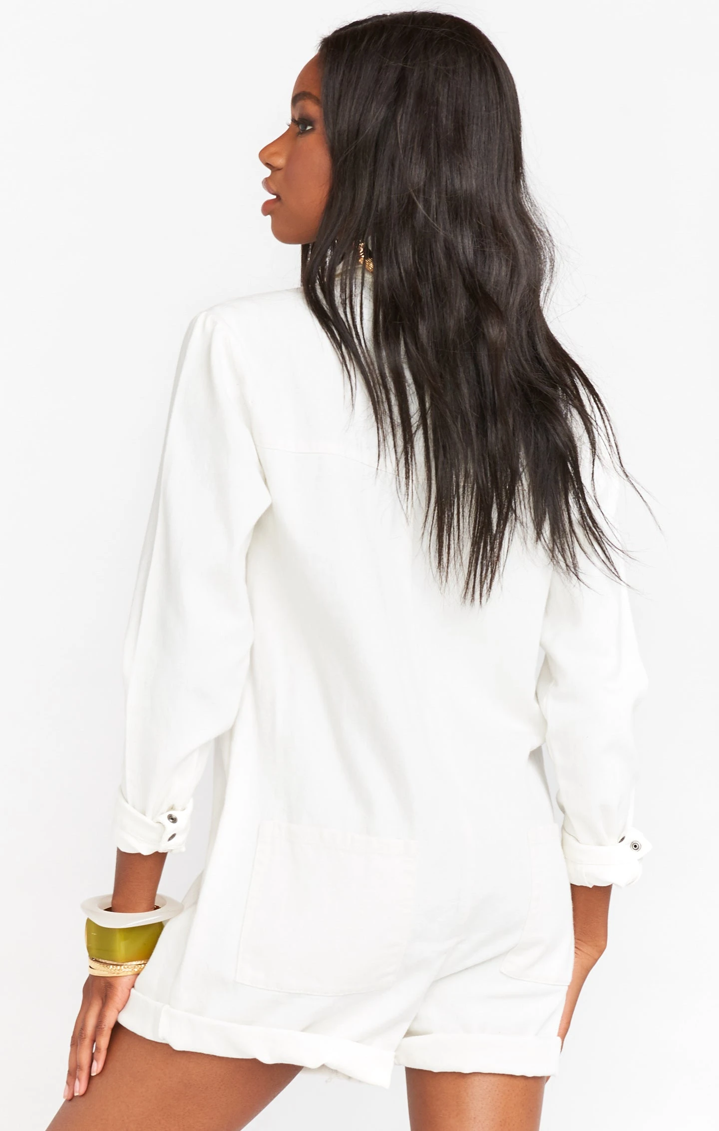 The Tegan is a one-and-done white denim romper that is effortless and easy to throw on. You’re able to roll up her shorts or not! Pair her with a belt and bucket hat for the perfect weekend outfit.