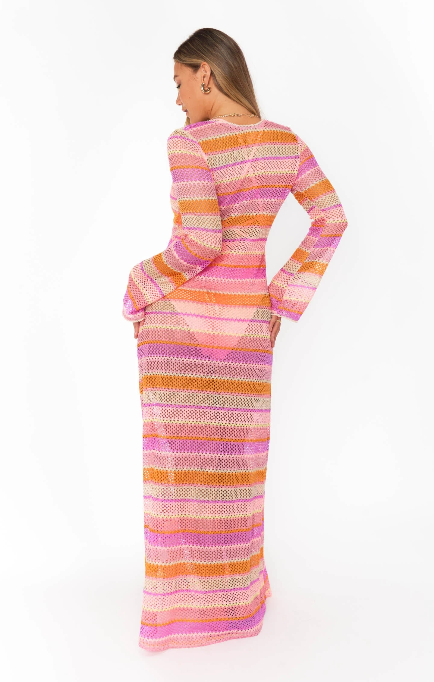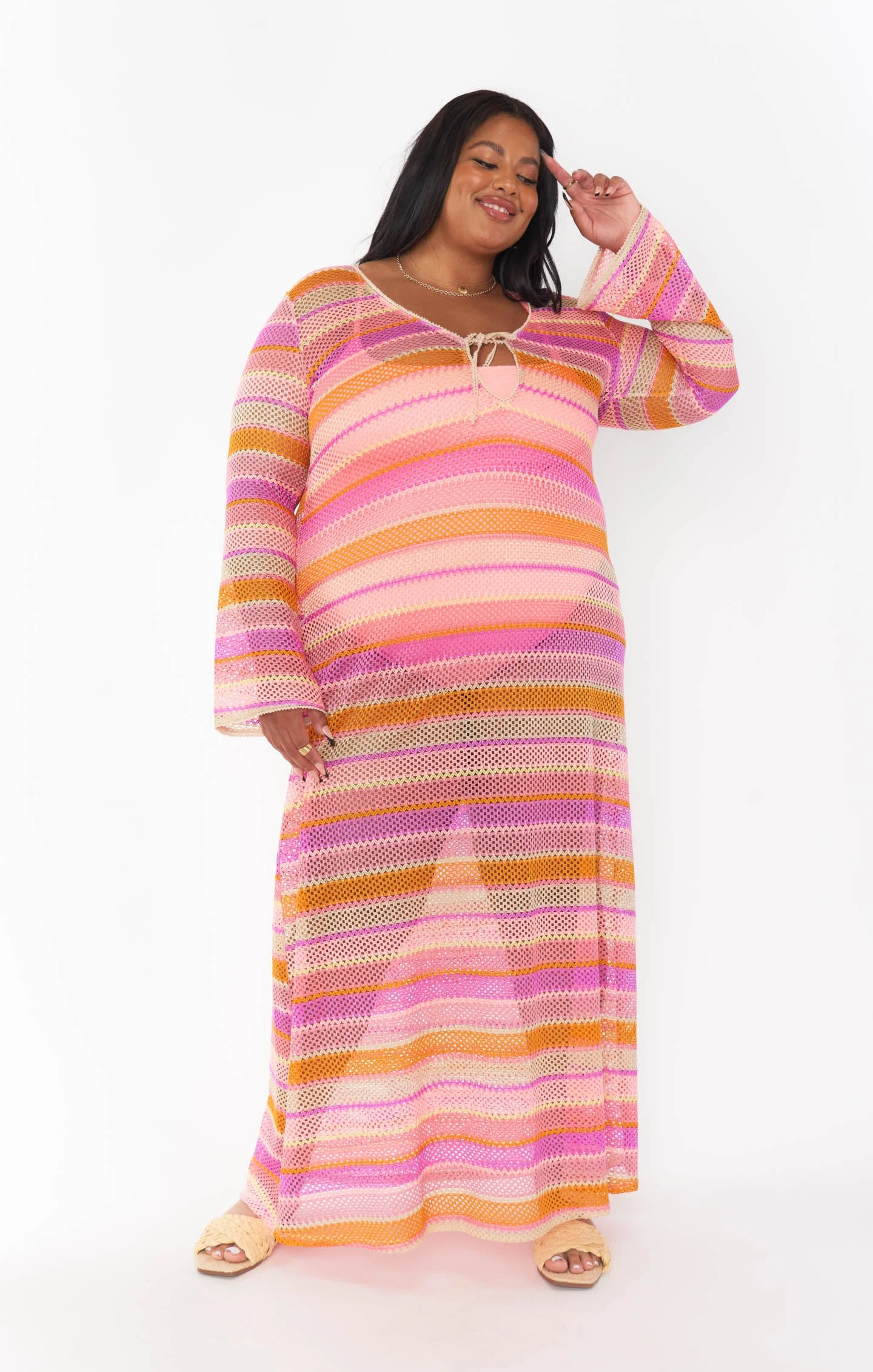 Beach bound with drink in hand in this mixed melon crochet coverup. The Vacay Coverup is a crochet maxi with long sleeves and a sweet tie front. Throw her on over a bikini with strappy sandals and straw hat.