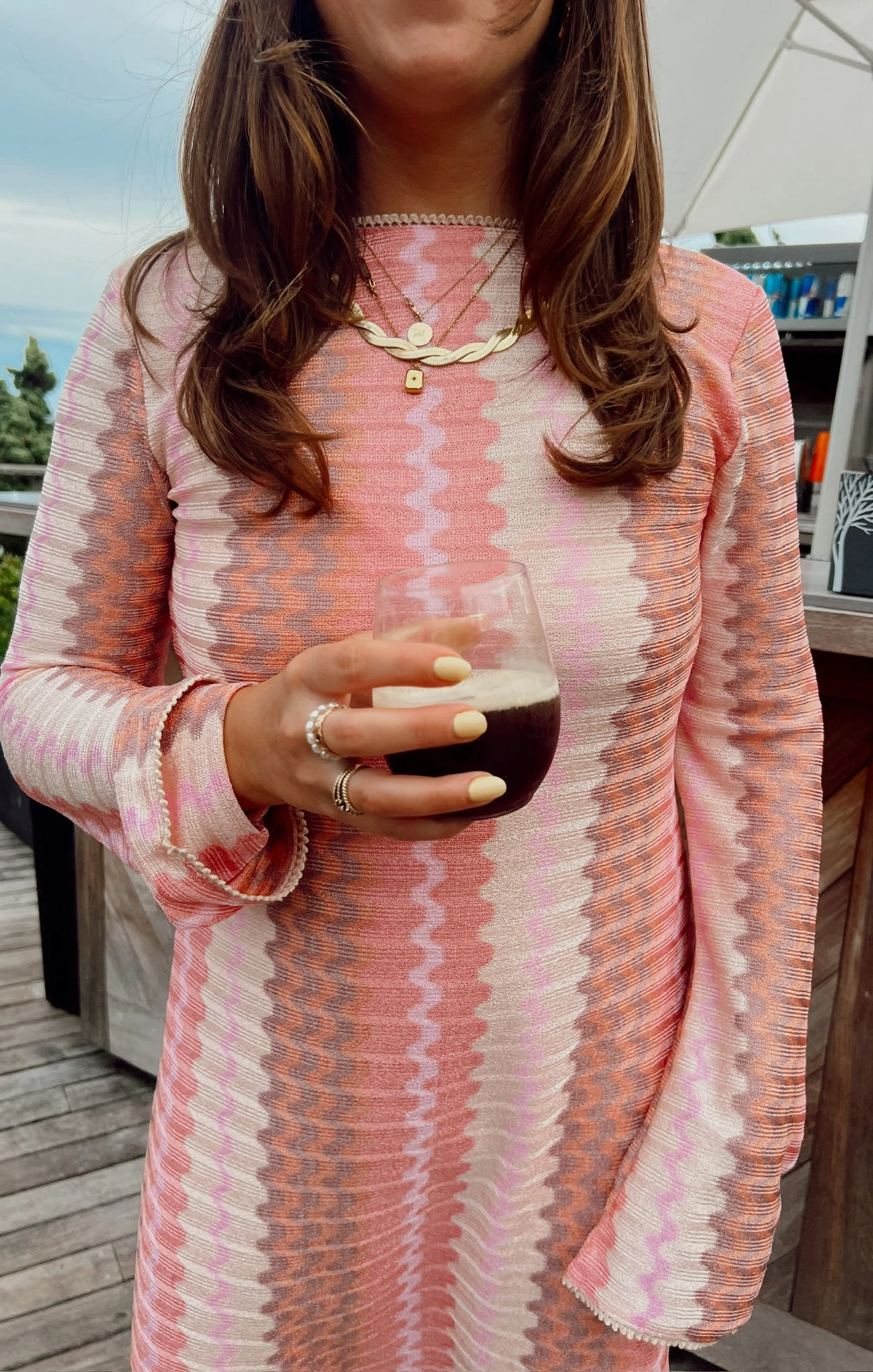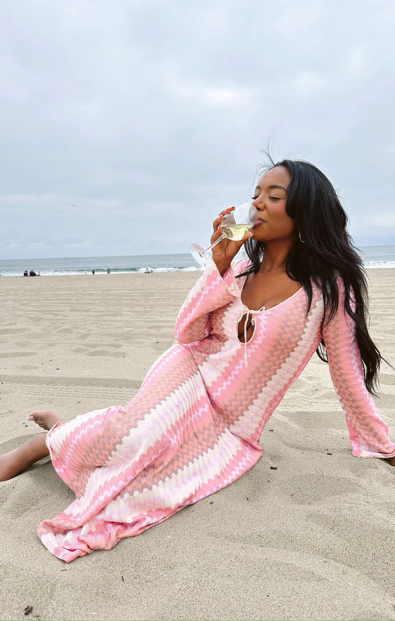 Beach bound with drink in hand in this groovy pink coverup. The Vacay Coverup is a crochet maxi with long sleeves and a sweet tie front. Throw her on over a bikini with strappy sandals and a straw hat or flip her backward for a high neck look!