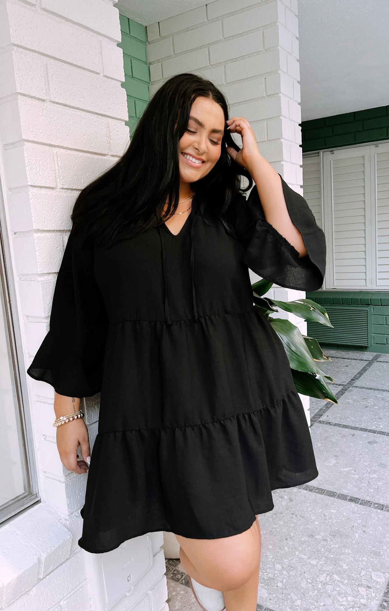 This flirty and flowy black mini dress has a tiered skirt and a tie front detail making it a boho dream! Soft ruffles along the 3/4 sleeves and bottom hem give a feminine touch.